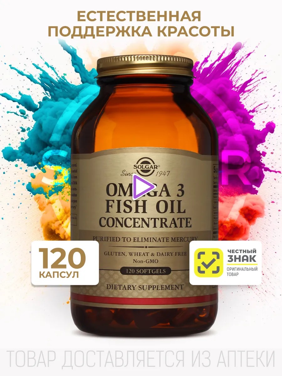 Solgar Концентрат рыбьего жира Омега 3 (Solgar omega,Fish Oil,Concentrate Softgels) - данная формула представляет собой натуральный концентрированный рыбий жир с оптимальным содержанием омега-3 полиненасыщенных жирных кислот, которые способствуют защите зрения, улучшению работы головного мозга, профилактике сердечно-сосудистых заболеваний, снижению уровня холестерина, способствуют хорошему настроению.При производстве капсул «Концентрат рыбьего жира Омега-3» применяется уникальная технология молекулярная дистилляция, которая позволяет удалить соли тяжелых металлов из рыбьего жира. Рыбий жир в капсулах. Для защиты от прогоркания и окисления в каждую капсулу «Концентрата рыбьего жира omega » добавлен натуральный витамин Е.Состав: концентрат рыбьего жира высокоочищенного (анчоус, макрель, сардины), желатин, глицерин (носитель), смесь токоферолов (антиокислитель).Рекомендуемый прием рыбьего жира 2 капсулы содержит: полиненасыщенные жирные кислоты омега 3 - 600 мг, в том числе: докозагексаеновую кислоту - 200 мг, эйкозапентаеновую кислоту - 320 мг. Для защиты от прогоркания и окисления в каждую капсулу добавлен натуральный витамин Е. Показания: поддержка сердечно-сосудистой системы, при гипертонии и ишемической болезни сердца, при нарушении кровообращения головного мозга, профилактика инсульта и инфаркта, при коронавирусной инфекции и для профилактики, при гастрите, при гепатитах, при сахарном диабете, при рассеянном склерозе, для иммунитета, для бодрости и повышения работоспособности, для кожи, волос, ногтей, от морщин, поддержка зрения.омега 3 капсулы принимать по 2 капсулы 1 раз в день во время еды или в соответствии с рекомендациями врача.