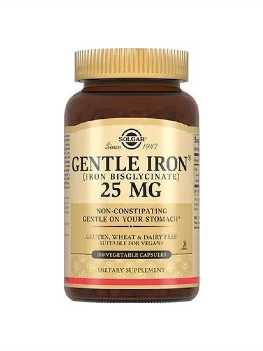 Солгар «Легкодоступное железо Джентл Айрон» содержит 25 мг железа в органической форме. Эта форма легко усваивается и снижает риск развития нежелательных эффектов со стороны желудочно-кишечного тракта. Разрешен беременным и кормящим женщинам по рекомендации и под наблюдением врача. Не содержит глютена, пшеницы, молочных продуктов Без консервантов. Подходит для вегетарианцев.