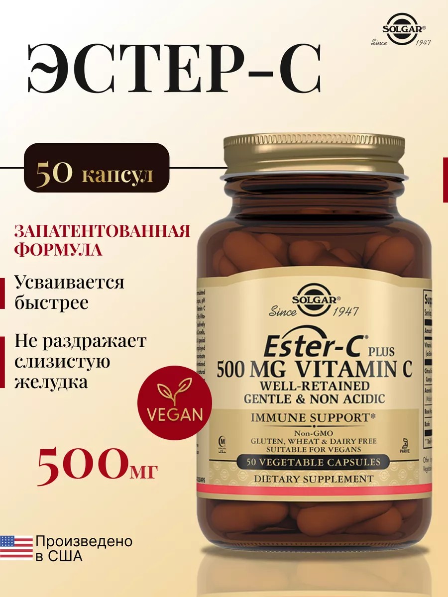 Солгар эстер-с плюс витамин C 500 мг поставляется в удобной упаковке, содержащей 50 капсул.