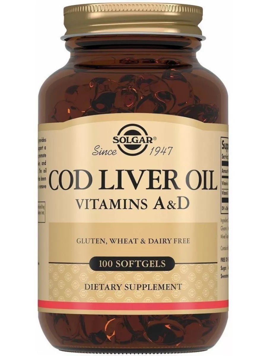 Cod liver oil capsules are recommended as a supplemental source of vitamins A and D, as well as omega-3 polyunsaturated fatty acids. Vitamin A helps strengthen the immune system, promote collagen synthesis, protect vision, and promote wound healing. Vitamin D plays a key role in strengthening bone tissue, reducing the risk of osteoporosis, increasing the body's resistance to infections, and raising levels of serotonin, the "happiness hormone." Cod liver oil is produced using molecular distillation, which removes heavy metals present in cod. In cases of skin damage (wounds, sunburn), vitamin A accelerates healing, promotes collagen synthesis, and improves the quality of newly formed tissue. Vitamin A is a powerful antioxidant, providing increased resistance to infections. Vitamin D, like vitamin A, is involved in numerous processes in the body.