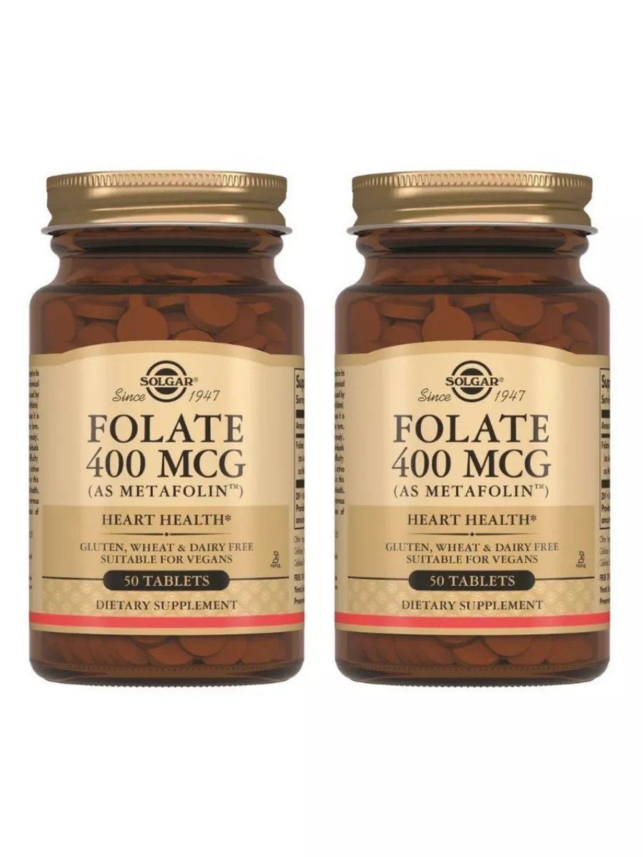 Folate 400 mcg Metafolin tablets are recommended as a supplemental source of folic acid. Solgar's Folate 400 mcg tablets provide the optimal amount of the active form of folic acid with high bioavailability in a single tablet, helping to replenish vitamin deficiency. Metafolin does not require additional metabolic conversion for activation and function in the body, which is especially important for those with the MTHFR gene polymorphism. Optimal metafolin levels during pregnancy ensure normal conditions for fetal development and growth. Metafolin use has a positive effect on reducing the risk of cardiovascular disease.