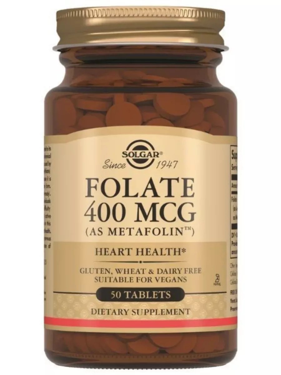 Folate 400 mcg Metafolin tablets are recommended as a supplemental source of folic acid. Solgar's Folate 400 mcg tablets provide the optimal amount of the active form of folic acid with high bioavailability in a single tablet, helping to replenish vitamin deficiency. Metafolin does not require additional metabolic conversion for activation and function in the body, which is especially important for those with the MTHFR gene polymorphism. Optimal metafolin levels during pregnancy ensure normal conditions for fetal development and growth. Metafolin use has a positive effect on reducing the risk of cardiovascular disease.