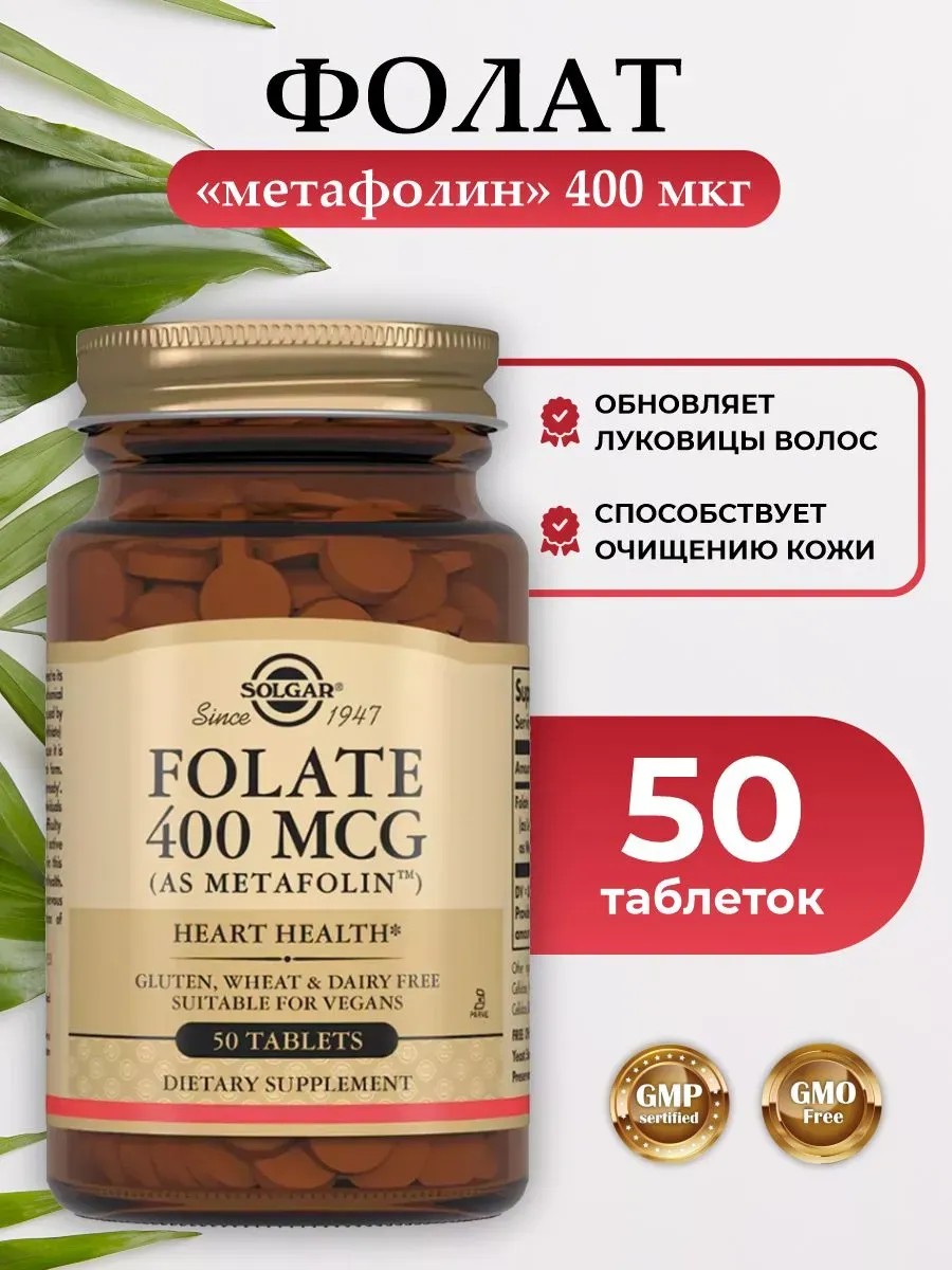 Таблетки «Фолат 400 мкг «Метафолин» рекомендуются в качестве дополнительного источника фолиевой кислоты. Фолат 400 мкг от Солгар - оптимальное содержание активной формы фолиевой кислоты с высокой биодоступностью в одной таблетке, которое позволит восполнить нехватку данного витамина в организме.