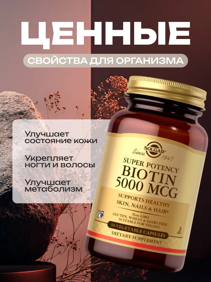 Solgar - Биотин 5000 мкг – высококачественная биологически активная добавка от премиального бренда Solgar, разработанная для укрепления волос, ногтей и поддержания здоровой кожи. Каждая таблетка содержит мощную дозировку биотина (5000 мкг), который способствует синтезу кератина, ускоряет рост волос, уменьшает их выпадение и ломкость, а также укрепляет ногтевые пластины, делая их более прочными и устойчивыми к расслаиванию. Биотин также играет важную роль в поддержании здоровья кожи, помогая сохранять ее упругость и эластичность. Препарат подходит для веганов, не содержит ГМО, глютена, пшеницы и молочных продуктов, что делает его безопасным для людей с пищевыми ограничениями. Рекомендуется принимать по 1 таблетке в день для достижения оптимального результата. Solgar – это эталон качества и надежности в мире витаминов и добавок, подтвержденный многолетним доверием потребителей. Перед применением проконсультируйтесь со специалистом.