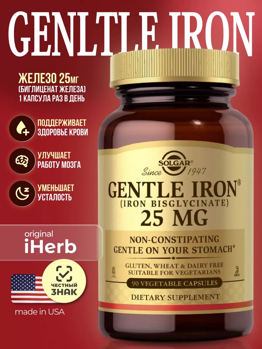 Железо относится к незаменимым микроэлементам необходимым для нормальной жизнедеятельности человека. При недостатке железа нарушается синтез гемоглобина, который выполняет важнейшую функцию в теле человека - транспорт кислорода к клеткам. Нахождение нужного количества железа очень важно для человеческого организма, Джентл Айрон содержит оптимальную суточную дозировку минерала в легко усваиваемой органической хелатной форме, которая обладает высоким профилем безопасности, сводя к минимуму риск развития побочных эффектов со стороны желудочно-кишечного тракта, а также, для поддержки здоровья крови, улучшения работы мозга и уменьшения усталости. Продукт подходит для людей с низким уровнем железа в организме, возникающим из-за неправильного питания, большого употребления кофе и чая, беременности и травм связанных с кроповотерей.