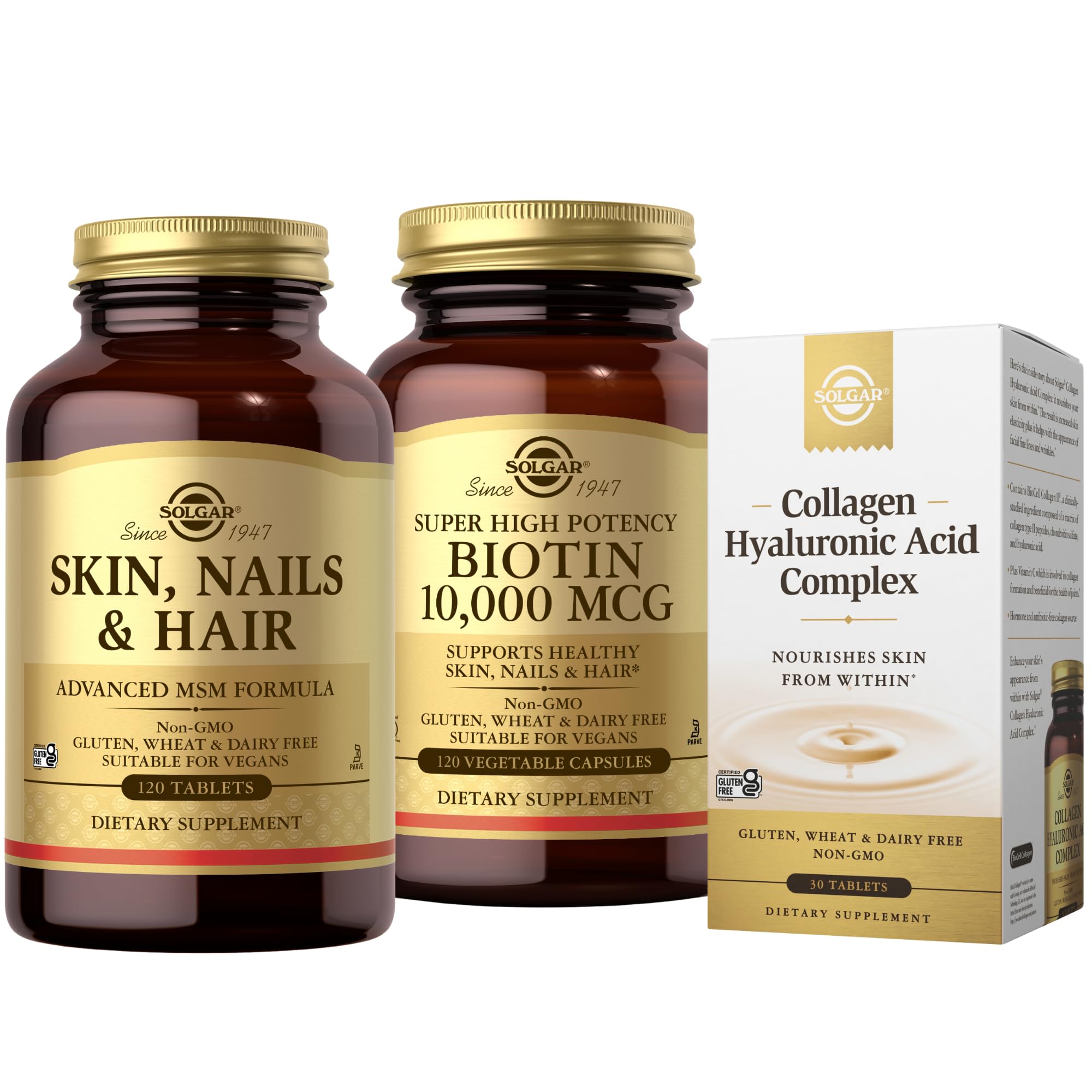 The Gold Standard: For over 70 years Solgar has been committed to quality, health, and well-being. Our mission is to create the finest nutritional supplements in small batches, through tireless research, using only the finest raw materials. Super High Potency Biotin is a water-soluble B vitamin This formulation provides 10,000 mcg of biotin per serving. Nourish Skin from Within Solgar Collagen Hyaluronic Acid Complex combines Hydrolyzed BioCell Collagen type 2 peptides, chondroitin sulfate, and hyaluronic acid to nourish skin from within. Nutrients For Skin, Nails, And Hair Many nutrients cannot be delivered to the body externally Solgar Skin, Nails Hair delivers a daily dose of Zinc (136 DV), Vitamin C (133 DV), Copper, MSM, and other key nutrients that support collagen. Bundle Includes: Solgar Skin, Nails Hair, Advanced MSM Formula, 120 Tablets Collagen Hyaluronic Acid Complex, 30 Tablets Biotin 10,000 mcg, 120 Capsules.