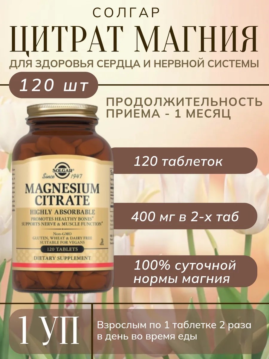Solgar Цитрат Магния - это высококачественный препарат, содержащий магний в виде цитрата, который обеспечивает лучшую усвояемость в организме. Магний играет важную роль в поддержании здоровья сердечно-сосудистой, нервной и мышечной систем, а также в обмене веществ и функционировании иммунной системы. Кроме того, магний улучшает сон и помогает справляться со стрессом. Solgar Цитрат Магния содержит 120 таблеток, которые удобно принимать и дозировать. Препарат не содержит глютена, ксенобиотиков, ГМО и искусственных красителей, что делает его безопасным для употребления.