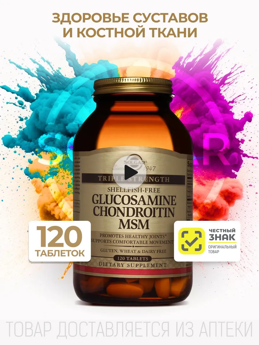 Солгар (Solgar) Таблетки Комплекс глюкозамина, хондроитина и МСМ (Glucosamine Chondroitin MSM Tablets) - сбалансированный состав.Данная формула, усовершенствованная путем добавления к глюкозамину и хондроитину МСМ (метилсульфонилметана), содержит все необходимые вещества, играющие важную роль в образовании и восстановлении хрящевой ткани.МСМ, являющийся источником органической серы, нужен для образования коллагена, придающего суставам и хрящам эластичную структуру. Исследования показывают, что МСМ оказывает наиболее положительный эффект на здоровье суставов при совместном приеме с глюкозамином.Глюкозамин, основной компонент хрящевой ткани, способствует восстановлению хряща и улучшению функционирования суставов.Хондроитин, природный компонент хрящевой ткани, способен удерживать воду в толще хряща, что способствует улучшению подвижности и снижению нагрузки на суставы.Рекомендуемый прием (2 табл.) содержит: глюкозамин гидрохлорид - 1500 мг, (глюкозамин - 1260 мг), что составляет 180% (глюкозамина) от адекватного уровня потребления,хондроитинсульфат -1200 мг, что составляет 200% от адекватного уровня потребления, соответственно, и не превышает верхний допустимый уровень, а также метилсульфонилметан - 700 мг. Не содержит глютена, пшеницы, молочных продуктов.Без консервантов. без красителей.без отдушек.