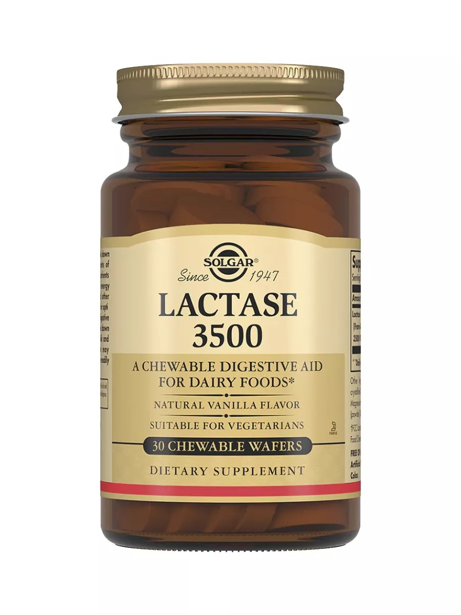 Solgar Lactase 3500 is a dietary supplement that contains the natural enzyme lactase, necessary for breaking down lactose in dairy products.