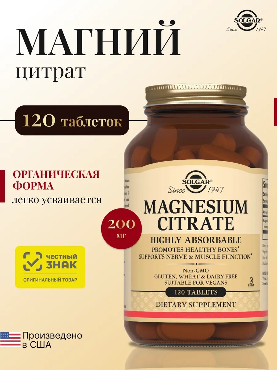 Солгар, Цитрат магния, 120 таблеток