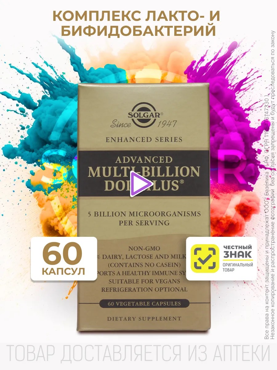 Solgar produces highly effective probiotic strains that work throughout the entire intestinal tract. They are genetically tested and completely safe. Unique manufacturing technologies from high-potency products ensure their effectiveness and hypoallergenicity. Multidophilus Plus capsules contain a unique combination of lyophilized ("dried") probiotic strains. This is why it is so important to avoid moisture in the capsule bottles. Previously, Solgar included a special sachet with granules in each bottle of probiotics that absorbed moisture from the air. This is no longer necessary. New innovative bottles, designed specifically for probiotic packaging, contain an inner layer of lyophilisate (desiccant) that is moisture-resistant and thus provides maximum protection for probiotics sensitive to changes in humidity. Contains lyophilisate of bifidobacteria and lactobacilli (does not require refrigeration). Free of starch and dairy products. Suitable for vegans. Biologically Active Substances (per 1 capsule): L. acidophilus, 1.25 x 10 CFU, B. lactis, 1.25 x 10 CFU, L. paracasei 1.25 x 10 CFU, L. rhamnosus 1.25 x IQ CFU. Indications: Recommended as a biologically active food supplement - an additional source of probiotics (bifidobacteria and lactobacilli). Multidophilus contains polysaccharides that provide protection for probiotics in the stomach. Probiotics are strains of vital microorganisms that make up the microflora of the vagina, intestines and other parts of the body. Each capsule of Multidophilus Plus No. 60 from Solgar contains about 5 billion essential microorganisms. How to take, course of administration and dosage: Adults take 1-2 capsules daily with meals. Ingredients: Multidophilus complex plus" (Lactobacillus acidophilus LA-5, Bifidobacterium lactis BB-12, Lactobacillus paracasei L. CASEI 431, Lactobacillus rhamnosus GG LGG), maltodextrin (stabilizer), microcrystalline cellulose (carrier), capsule shell [hydroxypropyl methylcellulose (carrier)], sodium alginate (stabilizer), silicon dioxide (anti-caking agent), magnesium stearate (anti-caking agent). 1-2 capsules contain 1.25 x 10(9) - 2.5 x 10(9) CFU/day of each strain (L. acidophilus, B. lactis, L. paracasei, L. rhamnosus).