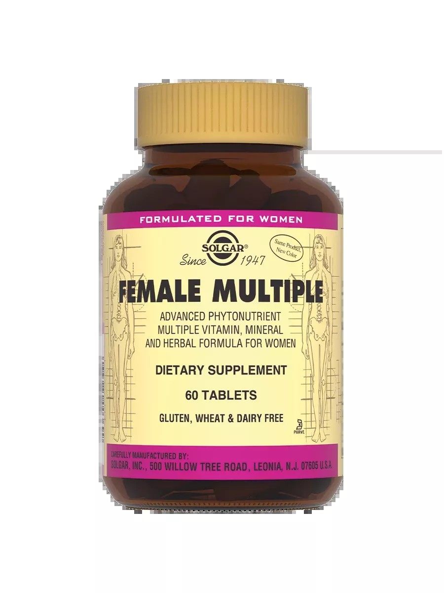 Composition: magnesium (magnesium oxide, magnesium citrate, magnesium bisglycinate), calcium (calcium carbonate, calcium citrate, calcium bisglycinate), microcrystalline cellulose (carrier), potassium bisglycinate, vitamin C (L-ascorbic acid, sodium ascorbate), proprietary blend (concentrate of radish, blackcurrant, apple, spirulina extract), choline bitartrate, croscarmellose (stabilizer), inositol, magnesium stearate (anti-caking agent), citrus bioflavonoid complex, iron bisglycinate, Stearic acid (stabilizer), hydroxypropyl methylcellulose (carrier), silicon dioxide (anti-caking agent), zinc (zinc oxide, zinc bisglycinate), American ginseng root extract, milk thistle seed extract, angelica root extract, uva ursi leaf extract, vitex chasteberry berry extract, black cohosh root and rhizome extract, soy isoflavones, niacin, d-alpha-tocopherol succinate, selenomethionine, manganese bisglycinate, glycerin (humectant), beta-carotene, chromium bisglycinate, calcium D-pantothenate, pyridoxine hydrochloride, sodium molybdate, cholecalciferol, thiamine mononitrate, riboflavin, copper (copper oxide, copper bisglycinate), mannitol (carrier), potassium iodide, vitamin K (phytonadione), folic acid, D-biotin, cyanocobalamin.