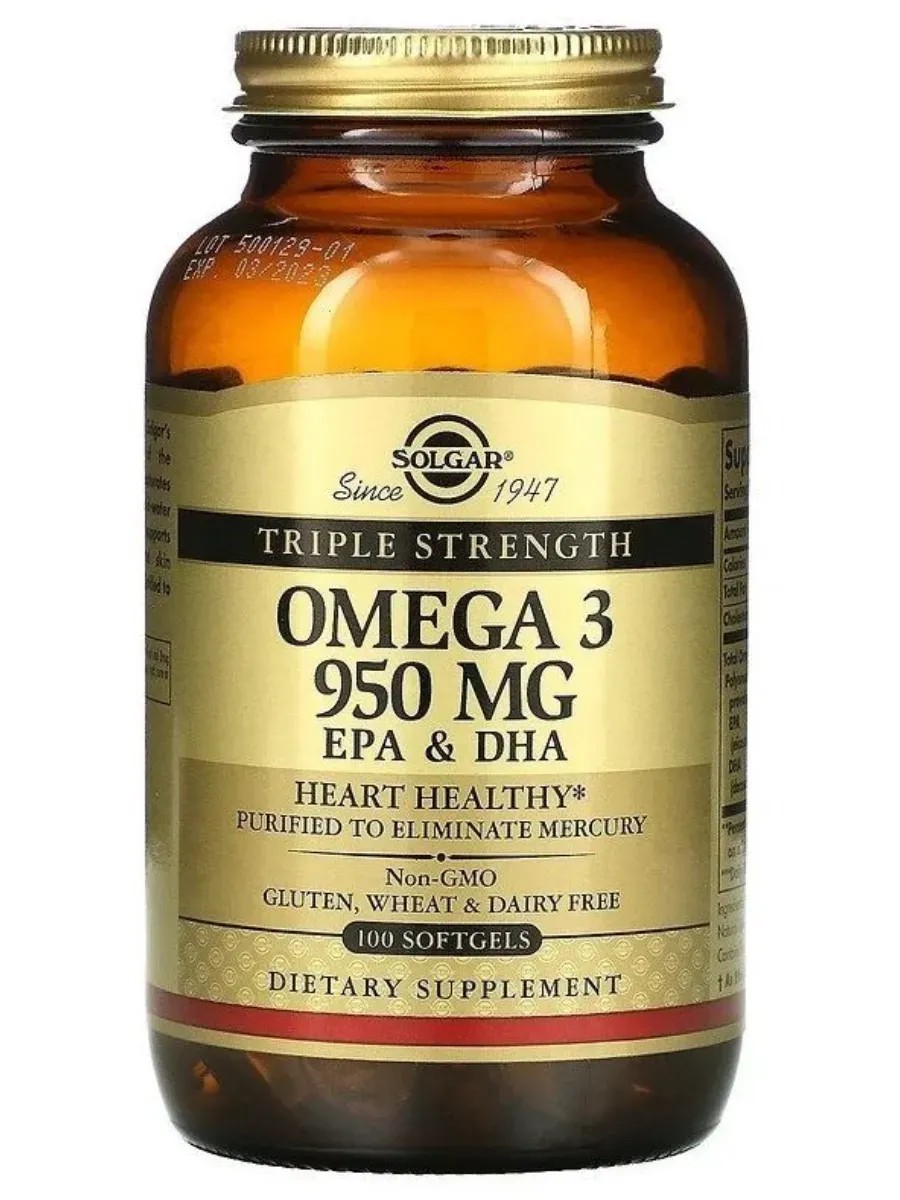 Полиненасыщенные жирные кислоты омега-3 относятся к группе эссенциальных жиров, так как участвуют в формировании мембран клеток головного мозга, зрительного анализатора и биологических мембран других органов и тканей. Поскольку организм человека их не синтезирует самостоятельно, они должны поступать с пищей. Для получения «Тройная Омега-3 950 ЭПК и ДГК» используется рыбий жир, богатый содержанием ПНЖК Омега-3, полученный из глубоководных рыб холодных морей (анчоус, макрель, сардины, сельдь). Из всех продуктов Солгар, содержащих жирные кислоты класса Омега-3, «Тройная Омега-3 950 ЭПК и ДГК» содержит самую высокую дозировку Омега-3 ПНЖК - 950 мг в одной капсуле. «Тройная Омега-3 950 мг ЭПГ и ДГК» производится по уникальной технологии молекулярной дистилляции - методу, который позволяет удалить соли тяжелых металлов из рыбьего жира. Для защиты от прогоркания и окисления в каждую капсулу «Тройная Омега-3 950 мг ЭПГ и ДГК» добавлен натуральный витамин Е.
