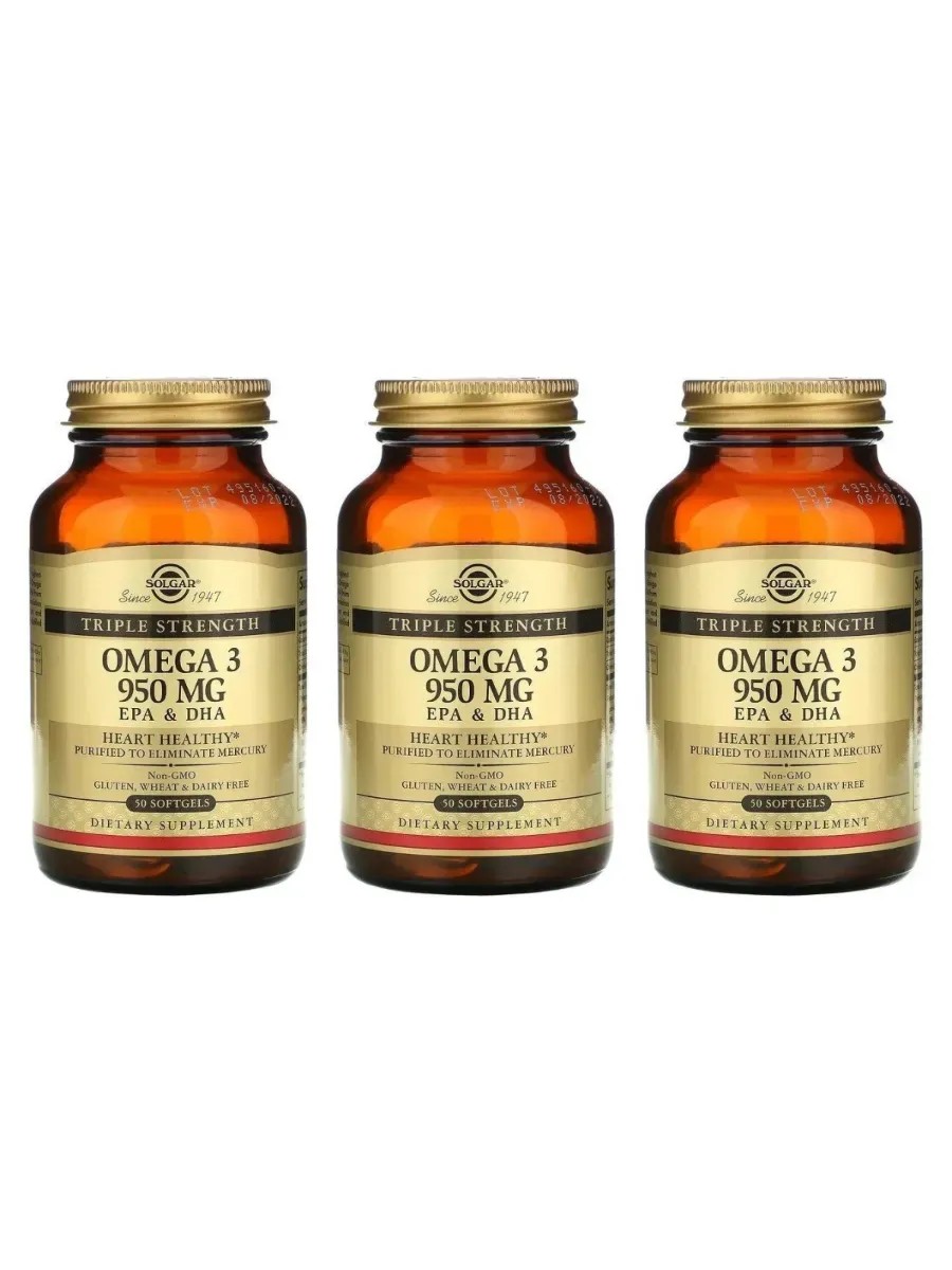 Полиненасыщенные жирные кислоты омега-3 относятся к группе эссенциальных жиров, так как участвуют в формировании мембран клеток головного мозга, зрительного анализатора и биологических мембран других органов и тканей. Поскольку организм человека их не синтезирует самостоятельно, они должны поступать с пищей. Для получения «Тройная Омега-3 950 ЭПК и ДГК» используется рыбий жир, богатый содержанием ПНЖК Омега-3, полученный из глубоководных рыб холодных морей (анчоус, макрель, сардины, сельдь). Из всех продуктов Солгар, содержащих жирные кислоты класса Омега-3, «Тройная Омега-3 950 ЭПК и ДГК» содержит самую высокую дозировку Омега-3 ПНЖК - 950 мг в одной капсуле. «Тройная Омега-3 950 мг ЭПГ и ДГК» производится по уникальной технологии молекулярной дистилляции - методу, который позволяет удалить соли тяжелых металлов из рыбьего жира. Для защиты от прогоркания и окисления в каждую капсулу «Тройная Омега-3 950 мг ЭПГ и ДГК» добавлен натуральный витамин Е.