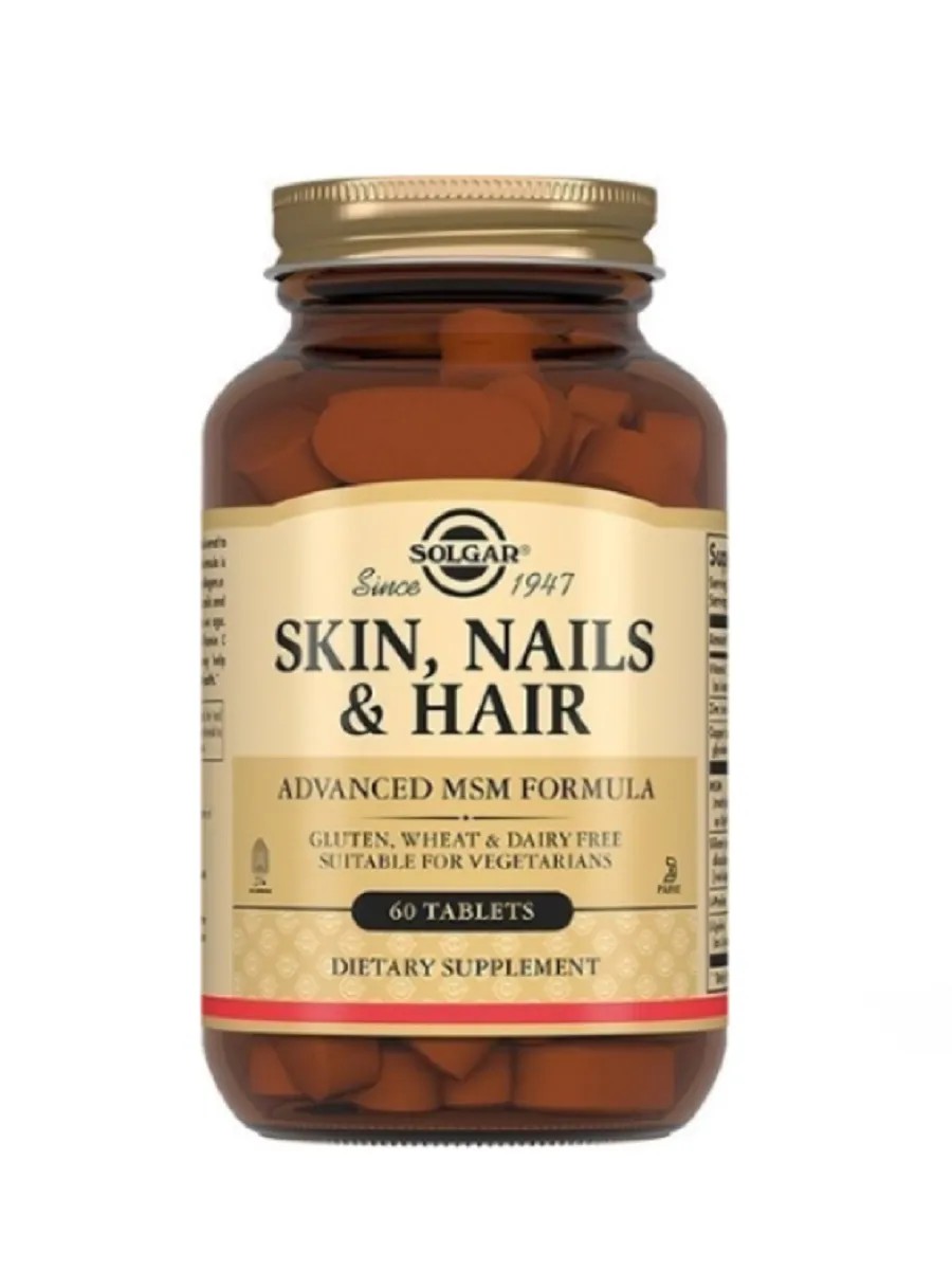 Solgar Skin, Nails, Hair is a dietary supplement. The Skin, Hair, Nails complex is based on MSM (methylsulfonylmethane), a source of organic sulfur and the main component of keratin (the building block of hair and nails) and collagen (the basis of skin). Its balanced composition helps improve skin firmness and elasticity; protect against the harmful effects of UV rays; regulate sebaceous gland activity; and strengthen hair and nails. Many nutrients cannot be obtained from the outside. This product is designed to maintain collagen levels, the main component of skin, nails, and hair, which decline with age. Taking nutrients such as vitamin C and copper orally helps maintain healthy hair, nails, and skin. Adults take 2 tablets daily with meals. Consult a doctor before use.