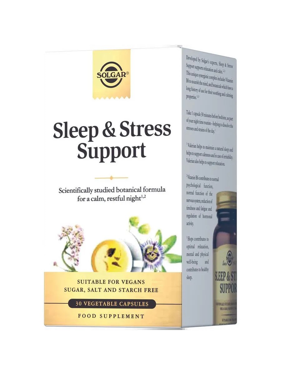 Stress is a natural part of life, but too much negative stress can cause serious harm to your health. The stress of juggling work, family, household chores, health, and finances can all impact your sleep quality and overall well-being. Instead of tossing and turning all night, turn to Solgar Sleep & Nighttime Stress Control. Developed by Solgar experts, this unique, plant-based, melatonin-free nighttime complex for stress and sleep quality contains a clinically studied herbal blend, vitamin B6, and the amino acid L-theanine in a bioavailable form. - Valerian extract helps reduce anxiety and irritability, - Passionflower extract helps reduce anxiety and improve sleep onset, - Hops extract improves sleep quality so you wake up feeling refreshed. - L-theanine, derived from green tea leaves, promotes relaxation, improves sleep onset, and improves sleep duration. sleep. It also improves stress resistance, concentration, memory, and promotes a good mood throughout the day. Vitamin B6 is essential for maintaining a healthy nervous system and energy levels, and plays a key role in the production of the sleep hormone melatonin.