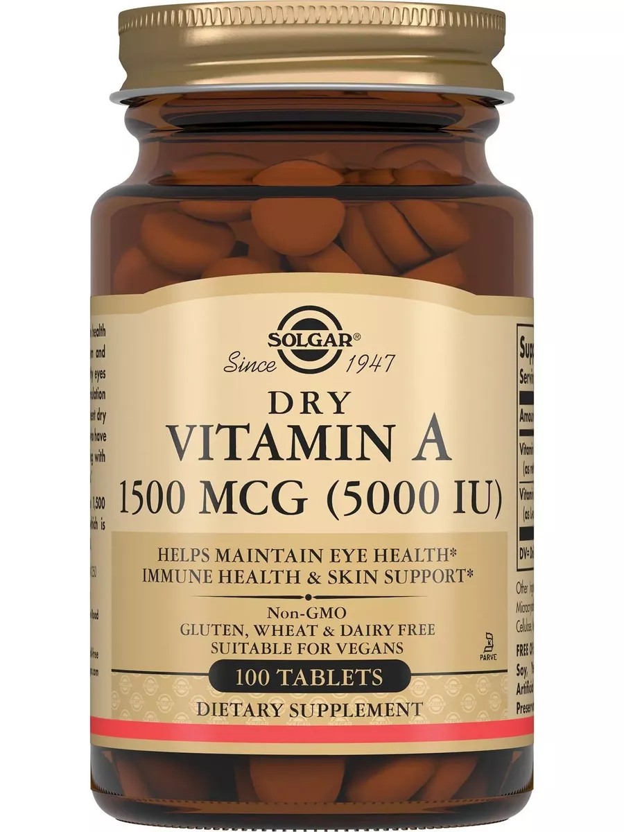 DRY VITAMIN A 1500 MCG (5000 IU) N100 TABLETS 370 MG Brand Solgar (Solgar) - a world-renowned manufacturer of highly effective natural health products. Biologically active food supplement (BAA)