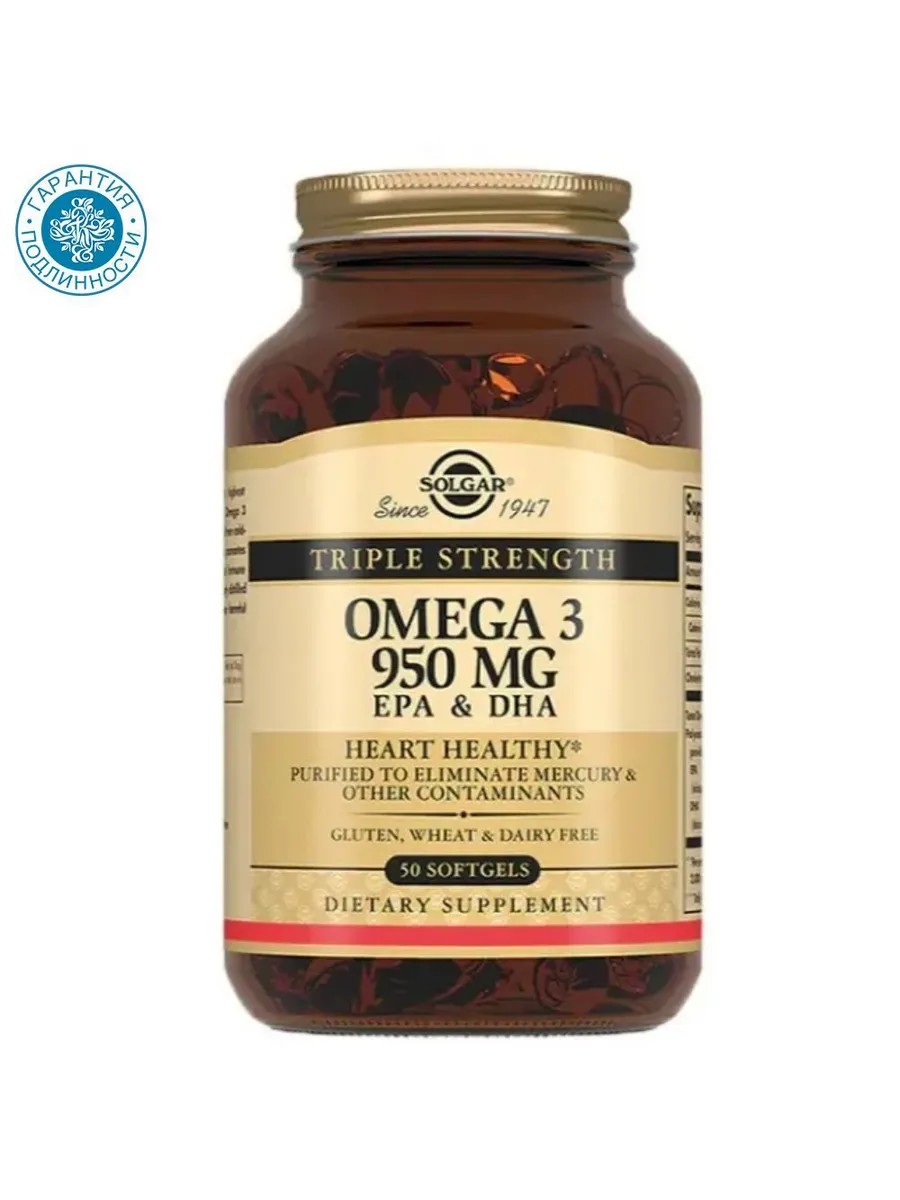 Капсулы с содержанием Тройной Омега-3 950мг ЭПК и ДГК разработаны американской компанией Solgar. Является биологически активной добавкой. Назначение - прием омега-3 ПНЖК помогает значительно снизить риск развития атеросклероза, инфаркта и других сердечнососудистых заболеваний, благодаря способности омега-3 ПНЖК снижать уровень холестерина и триглицеридов. Помимо этого омега-3 ПНЖК необходимы для работы мозга, способствуют сохранению здоровой сетчатки глаз, а также помогают уменьшить воспаление при артрите и снизить риск развития депрессивных расстройств. Капсулы массой 1950 мг. Продолжительность приема 1 месяц.
