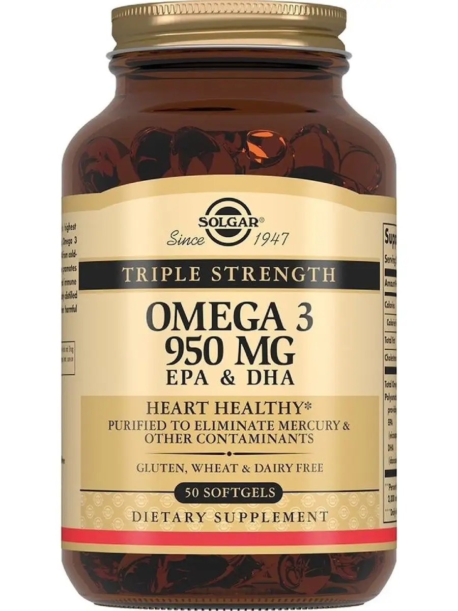 Из всех продуктов Солгар, содержащих жирные кислоты класса омега-3, Тройная омега-3 950 ЭПК и ДГК содержит самую высокую дозировку омега-3 ПНЖК 950 мг.