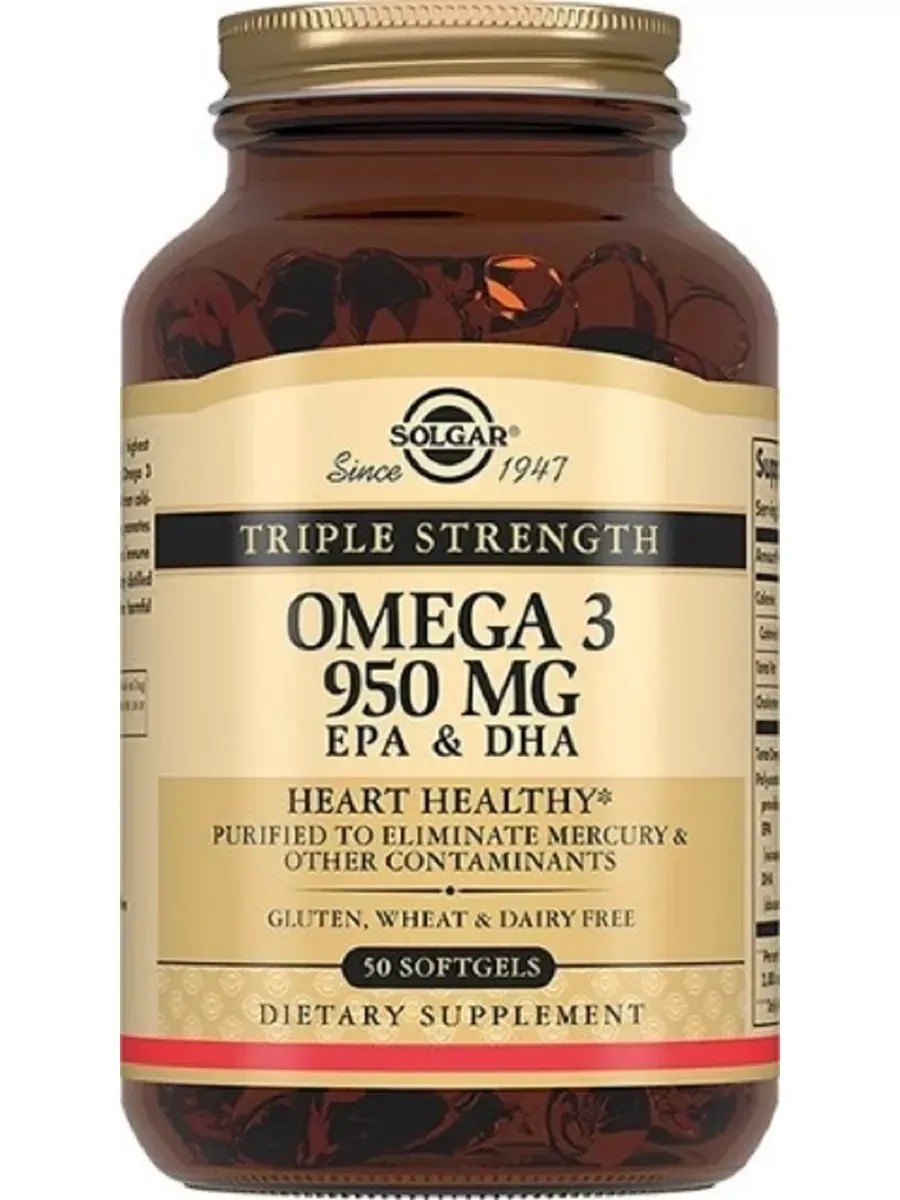 Solgar Triple Omega-3 950 mg EPA and DHA is a dietary supplement containing valuable fatty acids essential for human health. It contains a high concentration of eicosapentaenoic (EPA) and docosahexaenoic (DHA) acids, which are essential for the normal functioning of the body. Solgar Triple Omega-3 950 mg EPA and DHA has a positive effect on the cardiovascular system, improves brain function, and normalizes blood cholesterol levels. It also helps reduce inflammation in the body, boosts immunity, and protects cells from stress. Solgar Triple Omega-3 950 mg EPA and DHA capsules are easy and pleasant to take. They do not contain artificial colors, flavors, or preservatives, making them safe and effective for people of all ages and health levels. Take Solgar Triple Omega-3 950 mg EPA and DHA to support your health and feel better! Recommended as a dietary supplement - an additional source of omega-3 polyunsaturated fatty acids (eicosapentaenoic and docosahexaenoic acids).