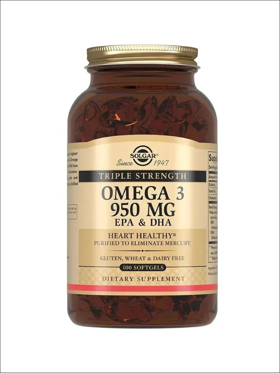 Solgar Тройная Омега-3 - это натуральный комплекс, содержащий эйкозапентаеновую кислоту (EPA), докозагексаеновую кислоту (DHA) и альфа-линоленовую кислоту (ALA). Эти вещества являются важными жирными кислотами, необходимыми для здоровья сердечно-сосудистой системы, мозга и зрения. Витамины Солгар Омега 3 - предлагает концентрированный источник полиненасыщенных жиров Омега 3 EPA и DHA. Незаменимые жирные кислоты (ЭПК и ДГК) в составе рыбьего жира поддерживают здоровье сердечно-сосудистой системы, суставов и клеток; Отличная ежедневная диетическая поддержка для здоровья и хорошего самочувствияКаждая капсула комплекса содержит 950 мг Омега-3, что является достаточным ежедневным нормативом для поддержания уровня жирных кислот в организме. Продукт производится из высококачественных морских рыб, проходит все необходимые контролирующие этапы и имеет международные сертификаты качества. Комплекс Solgar Тройная Омега-3 рекомендуется людям, заботящимся о здоровье своего организма и хотят насытить его важными жирными кислотами. Он не содержит искусственных ароматизаторов и консервантов, поэтому является безопасным для любого человека, в том числе для детей, беременных и кормящих женщин."Бренд Solgar (Солгар) - всемирно известный производитель высокоэффективных натуральных препаратов для здоровья. Капсулы «Тройная Омега-3 950 мг ЭПК и ДГК» (Triple Strength Omega-3 950 mg EPA & DHA Softgels) - сбалансированный состав. Внешний вид и свойства: довольно крупные желатиновые капсулы, продолговатой формы, желтоватого цвета
