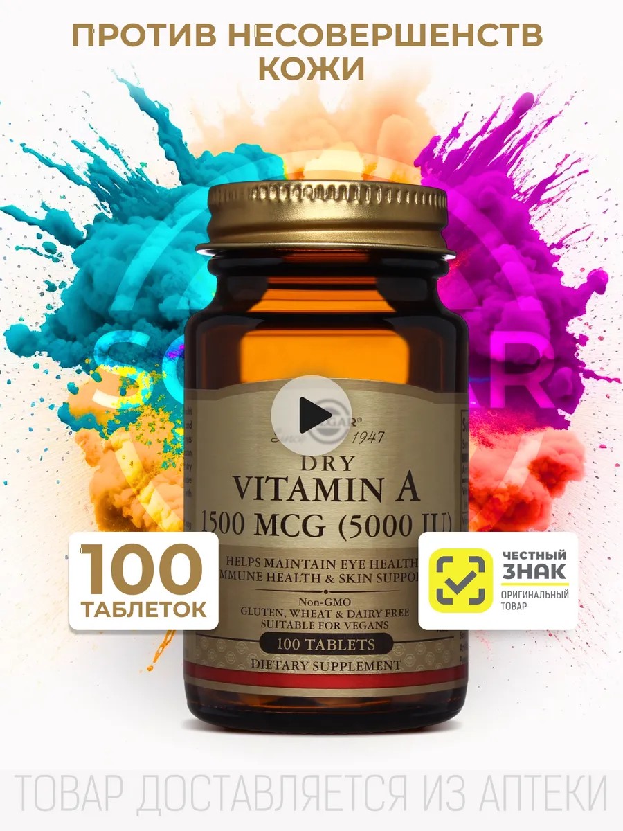 Витамины солгар Витамин А поддерживает здоровье иммунной системы и кожи, а также сохраняет здоровье глаз и зрение. Солгар витамины представлены в удобной сухой форме таблеток для тех, кому сложно глотать добавки на основе масла. Витамин а витамины для глаз здоровье, способствует оздоровлению кожи, росту молодых клеток, укреплению костной ткани и зубов, восстановлению слизистых оболочек мочевыводящих путей, дыхательной и пищеварительной систем. Сохраняет здоровье глаз; Витамин A бад улучшает зрение, предотвращает появление акнэ (угревой сыпи) и рекомендован при наличии сухой и трескающейся кожи. Поддерживает иммунитет и здоровье кожи; Не содержит глютен, пшеницу и молочные продукты; Подходит для вегетарианцев; Продукция высокого качества; Пищевая добавка. Солгар Витамин A улучшает зрение, предотвращает появление акнэ (угревой сыпи) и рекомендован при наличии сухой и трескающейся кожи. Хранить в сухом, недоступном для детей месте.Состав: дифосфат кальция (носитель); микрокристаллическая целлюлоза (носитель); ретинил пальмитат; аскорбиновая кислота; диоксид кремния (антислеживающий агент); магниевая соль стеариновой кислоты (антислеживающий агент), растительная целлюлоза (носитель). Витамин А: влияет на здоровье иммунной системы, сохраняет здоровье глаз и зрение, способствует оздоровлению кожи, росту молодых клеток, укрепляет костную ткань и зубы, восстанавливает слизистые оболочки мочевыводящих путей, дыхательной и пищеварительной систем, предотвращает появление акнэ (угревой сыпи) и рекомендован при наличии сухой и трескающейся кожи. Способ применения и дозировка: взрослым по 1 таблетке в день во время еды. Продолжительность приема - 1 месяц. Рекомендуемый прием (1 табл) содержит витамин А - 5000 МЕ - 188% от рекомендуемого уровня суточного потребления и не превышает верхний допустимый уровень.