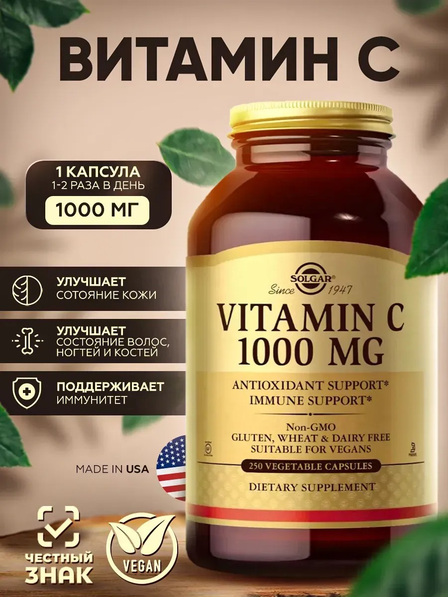 SOLGAR Витамин С, 1000 мг, 250 растительных капсул