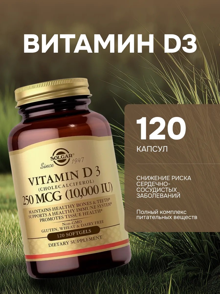 Витамин Д3 является необходимым питательным веществом, которое участвует в многочисленных процессах в организме. Это жирорастворимый витамин, который синтезируется в коже под действием УФ-лучей.Роль витамина Д3 в организме:укрепляет костную ткань (предотвращает развитие остеопороза, регулирует обмен и уровень содержания кальция и фосфора в организме, а значит регулирует их поступления в костную ткань и зубы, усиливает всасывание кальция в кишечнике);повышает иммунитет (снижает чувствительность организма к инфекциям);улучшает настроение (витамин Д3 повышает в организме уровень серотонина, «гормона радости»);снижает риск развития остеопороза, сердечно-сосудистых заболеваний, сахарного диабета 2-го типа, а также аутоиммунных заболеваний (например, таких как ревматоидный артрит, рассеянный склероз).Дефициту витамина Д3 особенно подвержены люди, проживающие в регионах с загрязненной атмосферой и коротким световым днем. А также мужчины и женщины старше 50 лет, люди с избыточной массой тела и смуглой кожей, также являются факторами риска недостаточного получения витамина Д3 даже при нахождении на открытом солнце.НЕ содержит клейковину, пшеницу, молочные продукты, сою, дрожжи, сахар, натрий, искусственные ароматизаторы, подсластители, консерванты и красители.Витамин D3 - это жирорастворимый витамин, который необходим для усвоения кальция, что помогает поддерживать здоровье костей и зубов. Витамин Д3 также поддерживает здоровую иммунную систему и нервно-мышечную функцию. Витамин D3 в этом продукте представляет собой ту же форму, которую организм вырабатывает, когда наша кожа подвергается воздействию солнечного света. С возрастом наш организм может менее эффективно усваивать это важное питательное вещество. Солга р Витамин д3 - натуральная, легко усваиваемая форма витамина д для поддержки иммунитета, здоровья мышц, костей и хорошего сна и развития памяти. Витамин D необходим для улучшения усвоения кальция, что помогает поддерживать здоровье костей и зубов. Витамин D3 в этом продукте представляет собой ту же форму, которая вырабатывается организмом, когда наша кожа подвергается воздействию солнечного света. С возрастом наш организм может поглощать меньше витамина Д. Эти передовые мягкие капсулы на масляной основе способствуют оптимальному усвоению. Уже более 70 лет Solga r стремится к качеству, здоровью и благополучию. Способствует укреплению иммунитета, не содержит ГМО. В мягких капсулах содержится важнейший витамин D-3 в легко усвояемой жидкой форме.Рекомендации по применению:принимать 1 капсулу в день во время еды или по рекомендации специалиста.