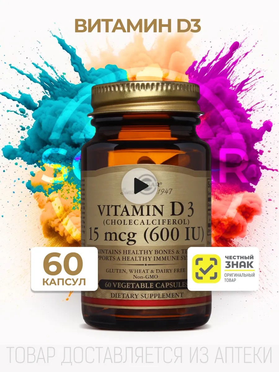 Солгар витамин д 3 600 МЕ - это биологически активная добавка (БАД) к пище - витаминный комплекс в форме капсул, который обеспечивает нормальный уровень витамина D3 в организме человека. Продукт представлен в упаковке из 60 капсул, что позволяет использовать его на протяжении 2 месяцев. Витамин D3 является важным элементом для здоровья костной ткани, а также иммунной и нервной системы.