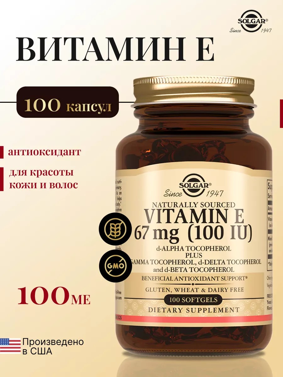 Капсулы «Витамин Е 100 МЕ» (Vitamin E 100 IU Soft gels) - содержит натуральный витамин Е, представленный в виде d-альфа токоферола, а так же смесь изомеров токоферола (d-бета, d-дельта, d- гамма), которые усиливают антиоксидантные свойства витамина Е.