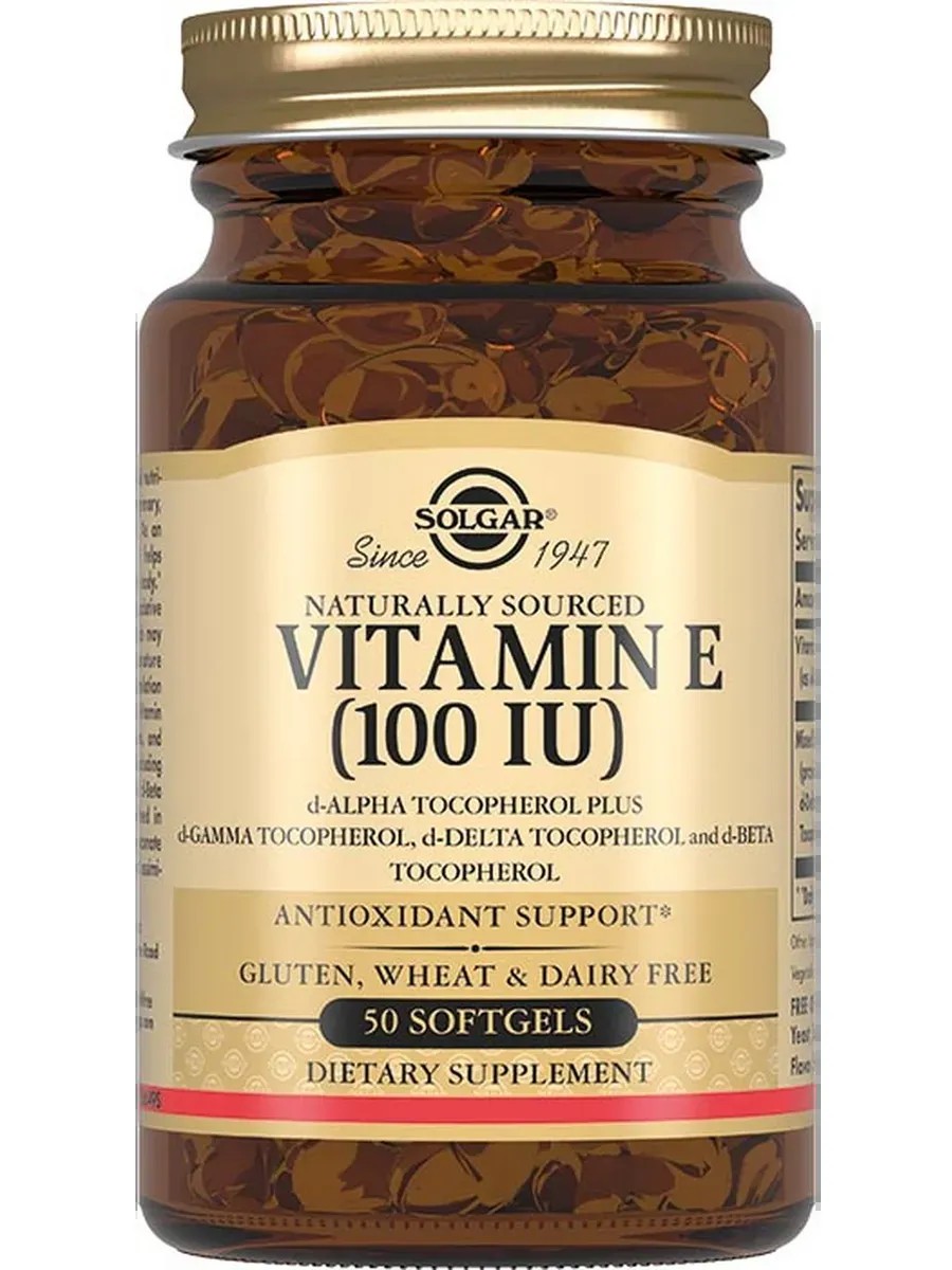 Vitamin E 100 IU Softgels contain natural vitamin E in the form of d-alpha tocopherol, as well as a mixture of tocopherol isomers (d-beta, d-delta, d-gamma), which enhance the antioxidant properties of vitamin E. Vitamin E has an antioxidant effect, helps protect the cardiovascular system, and helps reduce the risk of premature skin aging. Contains no sugar, salt, or starch.