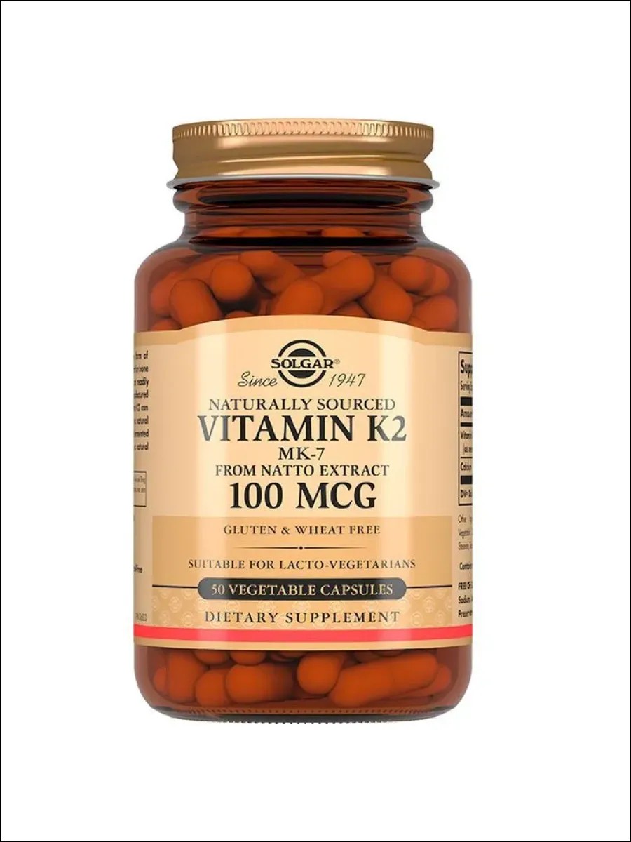 биологически активная добавка к пище "Капсулы "Натуральный витамин К2 (менахинон 7) - 100 мкг" ("NaturalIy Sourced Vitamin K2 рекомендуется в качестве дополнительного источника витамина К2, содержащей кальций. «Натуральный витамин К2 (менахинон 7) 100 мкг» от Солгар – это активная форма витамина К2 в виде менахинона с высоким уровнем биодоступности в оптимальной дозировке 100 мкг для восполнения суточной потребности организма.