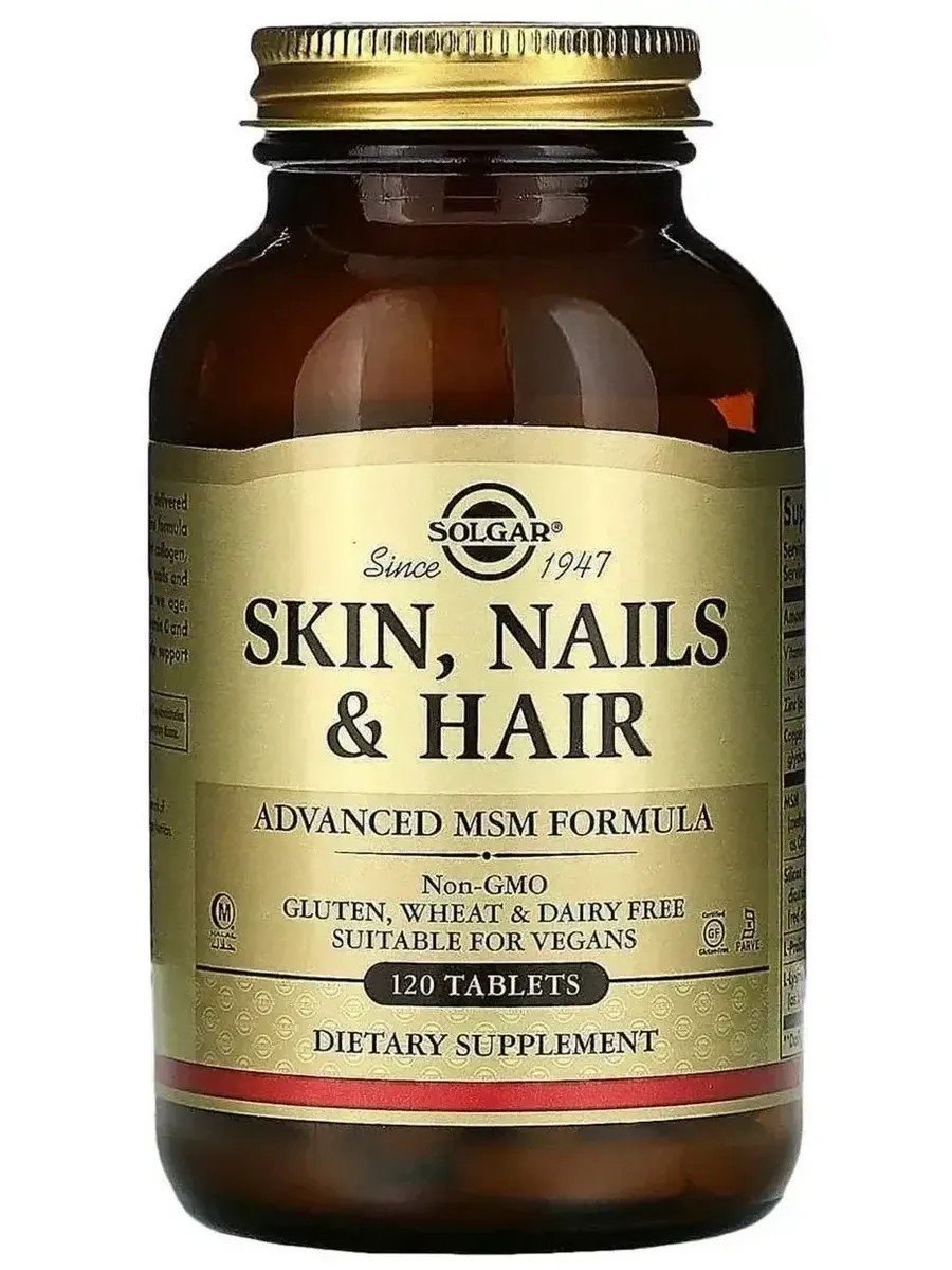 Solgar Skin, Nails & Hair Комплекс витаминов "Кожа, Ногти и Волосы", известный производитель высокоэффективных натуральных препаратов для здоровья. Данный комплекс имеет сбалансированный состав, основу комплекса «Кожа, волосы, ногти» составляет МСМ (метилсульфонилметан) - источник органической серы, основной компонент кератина (строительный элемент волос и ногтей), а также коллагена (основа кожи). Сбалансированный состав без консервантов позволяет коже придавать упругость, эластичность; защищать от пагубного воздействия УФ-лучей; регулировать деятельность сальных желез; укреплять волосы и ногти. Подходит для вегетарианцев. В составе отсутствуют красители и отдушки.