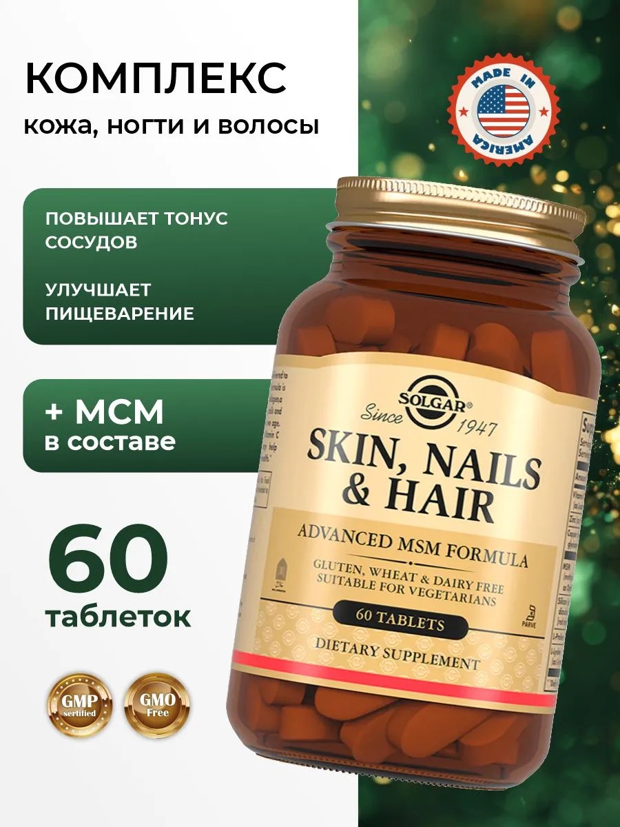 Витамины Солгар для волос ногтей и кожи - основу составляет МСМ (метилсульфонилметан) это источник органической серы, основной компонент кератина (строительный элемент волос и ногтей), а также коллагена (основа кожи). Сбалансированный состав позволяет сохранить упругость и эластичность кожи, защитить от пагубного воздействия УФ-лучей, а также регулировать деятельность сальных желез, укреплять волосы и ногти. Рекомендации по применению: Взрослым по 2 таблетки в день во время еды. Многие питательные вещества не могут быть доставлены в организм извне. Специализированная формула Solgar предназначена для поддержки коллагена в организме. Коллаген является основным компонентом кожи, волос и ногтей, который потенциально может уменьшаться в организме по мере того, как мы продолжаем стареть. Формула Солгар для красоты и здоровья также содержит питательные вещества, такие как витамин С и медь, которые при внутреннем употреблении помогают поддерживать здоровье волос, кожи и ногтей. Все таблетки сертифицированы, не содержат ГМО и сертифицированы без глютена. Они не содержат: глютен, пшеницу, молочные продукты, дрожжи, сахар и натрий. Они также не содержат искусственных ароматизаторов, подсластителей и консервантов. Натуральный препарат Солгар Витамины для Кожи, Волос и Ногтей произведенный на основе метилсульфонилметана (МСМ) - источника органической серы - разработан специально для сохранения природной женской красоты и содержит в себе полный комплекс нужных для здоровья кожи, ногтей и волос компонентов.Достаточное количество серы служит залогом нормального образования кератина и коллагена, гарантирующих силу, эластичность и быстрый рост волос, прочность ногтей и великолепную сияющую кожу.Регулярный прием СОЛГАР Витамины для Кожи, Волос и Ногтей поможет заметно сократить возрастные изменения кожи, наладить работу сальных желез, убирая сальный блеск и улучшая общее состояние кожного покрова. Благодаря витаминному комплексу волосы перестают выпадать и ломаться, и укрепляются ногтевые пластины.