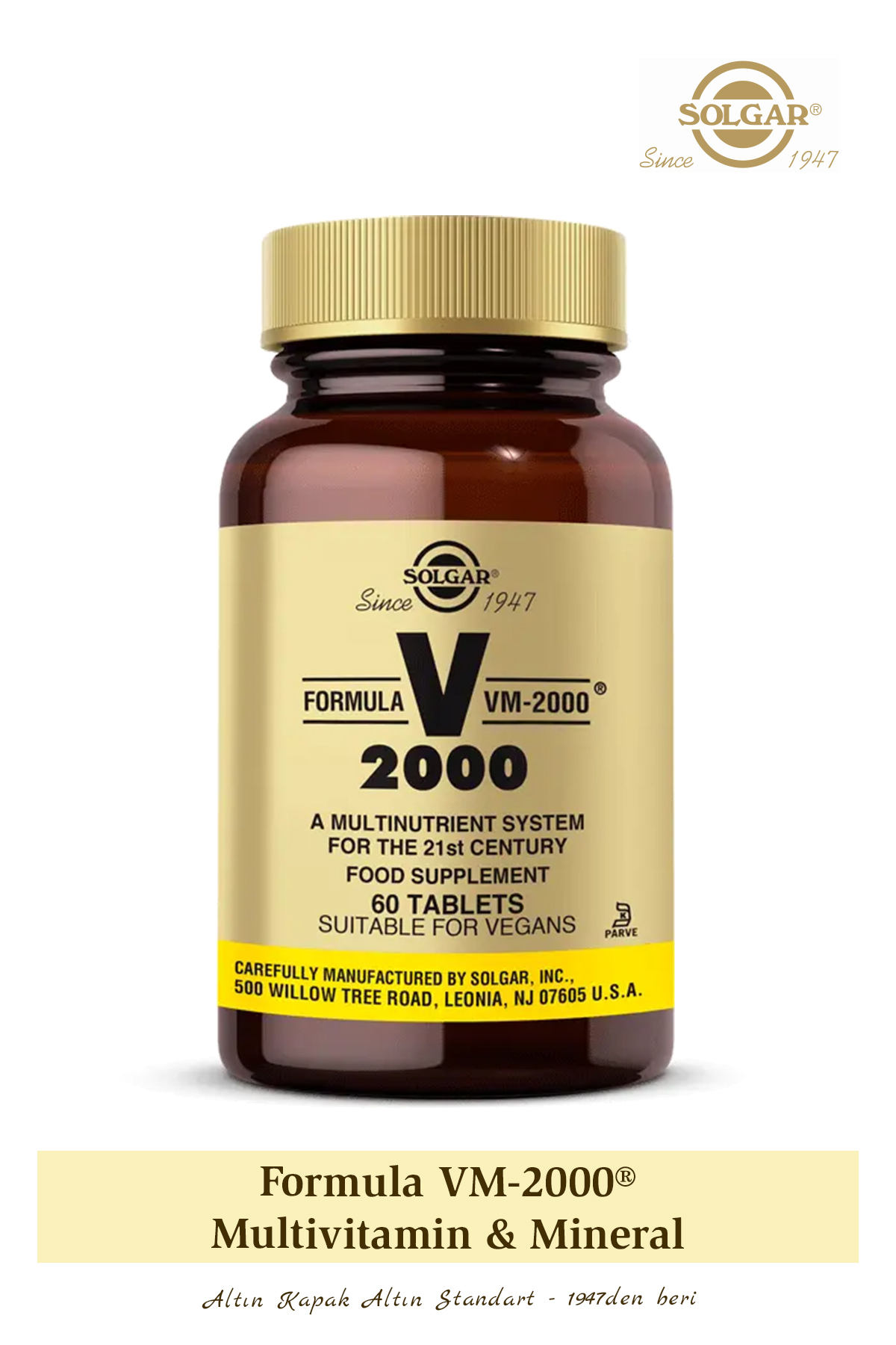 • Solgar VM 2000 Multi Vitamin 60 Tablet Kullanim önerisi: Günde 1-2 tablet tercihen yemeklerden sonra kullanilir. Içerik: Her tablette, B1 vitamini (Tiamin mononitrat) 50 mg B12 vitamini (Kobalamin) 50 mcg B2 vitamini (Riboflavin) 50 mg B3 vitamini (niasin) 50 mg B6 vitamini (pridoksin HCL) 12.5 mg Bakir 0.75 mg Betain HCL 12.5 mg Biotin 50 mcg Boron 0.5 mg C vitamini (Askorbik asit) 150 mg Çinko 7.5 mg D vitamini (Kolekalsiferol) 5 mcg Demir (Bisglisinat) 5 mg Dogal beta karoten 6 mg Dogal gida bitki tozu bazi 130 mg E vitamini 100 IU Folik asit 200 mcg Inositol 50 mg Iyot (Potasyum iyodür) 75 mcg Izole soya proteini 100 mg Kalsiyum (askorbat selati) 32.5 mg Karotenoid karisimi 114.5 mcg Kolin (Bitartarat) 20.5 mg Krom (Nikotino glisinat aminoasit selati) 12.5 mcg L-Glutatyon 2.5 mg L-Ornitin HCL 3 mg Magnezyum 15 mg Molibden (Glisinat) 25 mcg Pantotenik asit 50 mg Potasyum 5 mg Pridoksal-5-fosfat 10 mg Selenyum 12.5 mcg Soya lesitini 10 mg Taurin 2.5 mg Gida taksviyesidir. Seker, nisasta, maya, bugday ve süt ürünleri gibi potansiyel alerjenler içermez.Sentetik renklerndirici, koku düzeltici, tatlandirici ve koruyucu kullanilmamistir