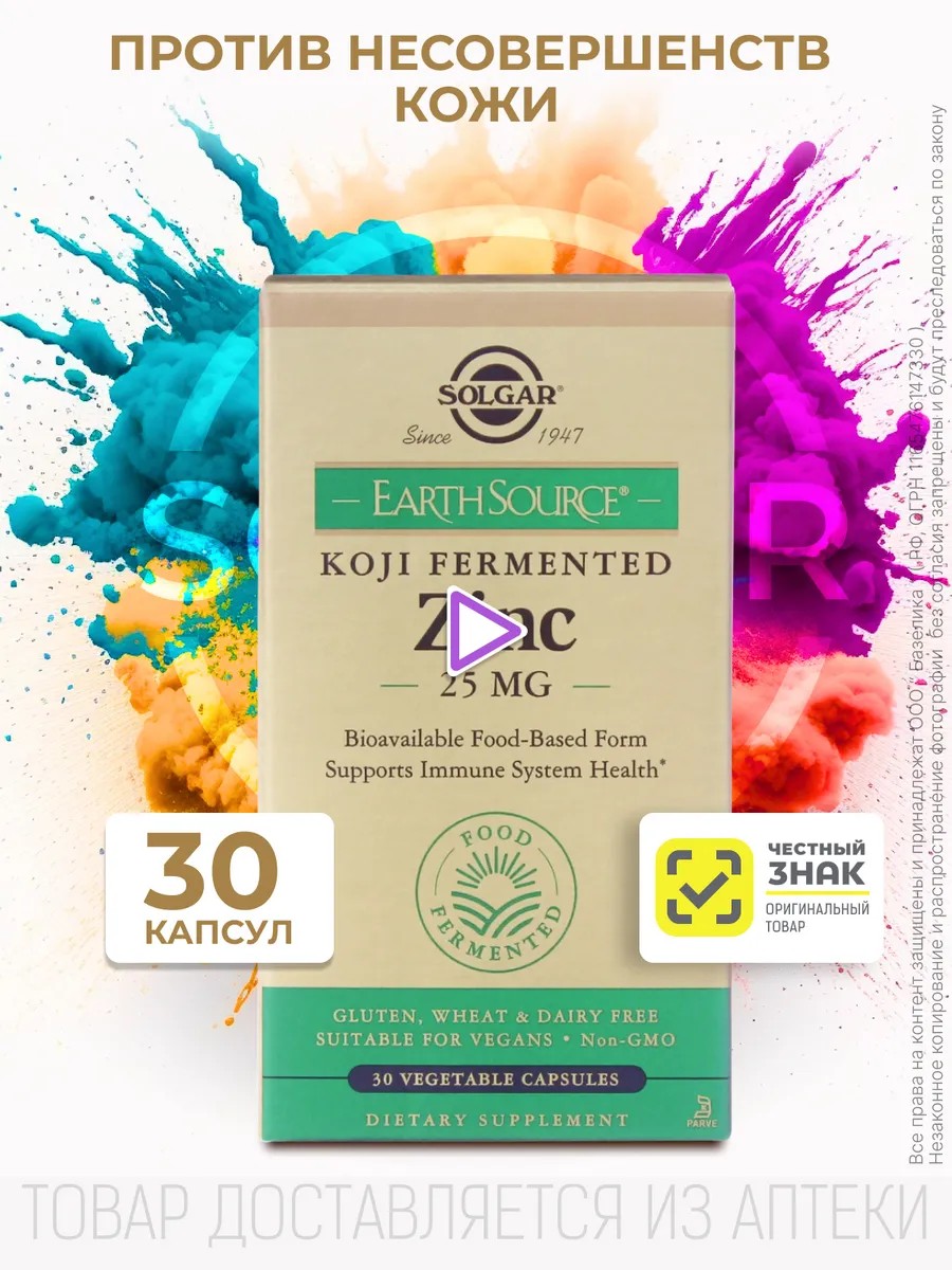Солгар «Капсулы «Цинк 25 мг в ферментированной культуре Коджи» (Koji Fermented Zinc 25 mg Vegetable Capsules).Цинк из органического источника Коджи в капсульной форме.Цинк необходим для многих функций организма, в том числе для поддержки иммунной системы, красоты кожных покровов, органов зрения, гормональной и нервной систем. Помимо этого, цинк обладает антиоксидантной активностью, препятствует выпадению волос, участвует в синтезе коллагена и стимулирует секрецию инсулина. Культура Коджи тесно связана с японской культурой на протяжении более 2000 лет данная технология используется в производстве уксуса, соевого соуса и мисо. Коджи - японский термин, означающий «культивируемое зерно» из закваски, выращенной на рисе. Продукт получают путем введения цинка в ферментированную среду Коджи. По мере созревания и брожения среды, минерал вводится в культуру и сохраняется в ней. Благодаря ферментированной среде цинк приобретает готовую к усвоению форму.Цинк 25 мг в ферментированной культуре Коджи - инновация от Solgar, высокобиодоступная форма цинка, которая легко усваивается организмом с минимальным риском развития побочных эффектов со стороны ЖКТ, а капсульная форма обеспечивает комфортный прием.