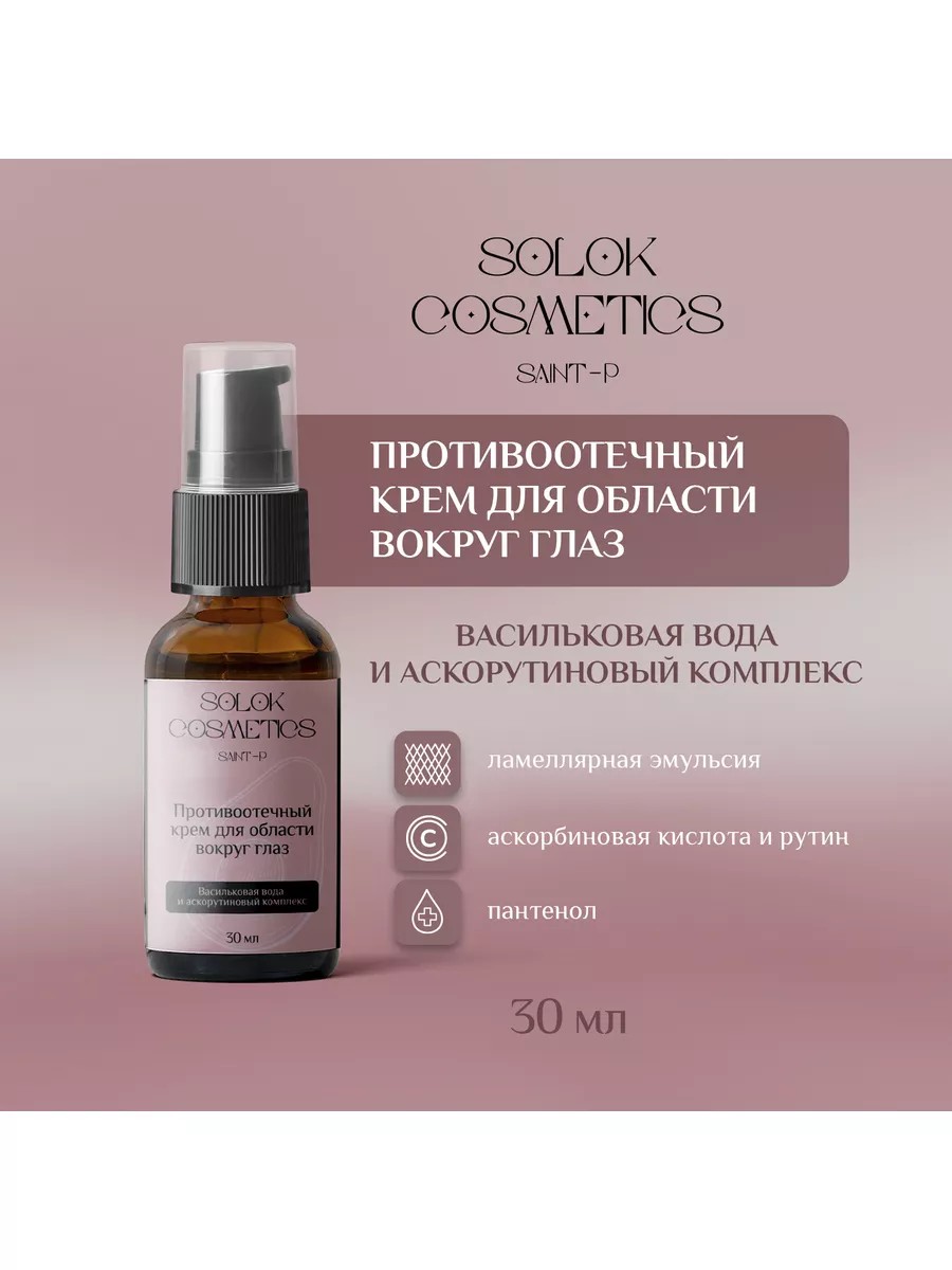 Рутинное применение крема для области вокруг глаз Solok Cosmetics снизит проявление отечности и выраженность темных кругов под глазами.