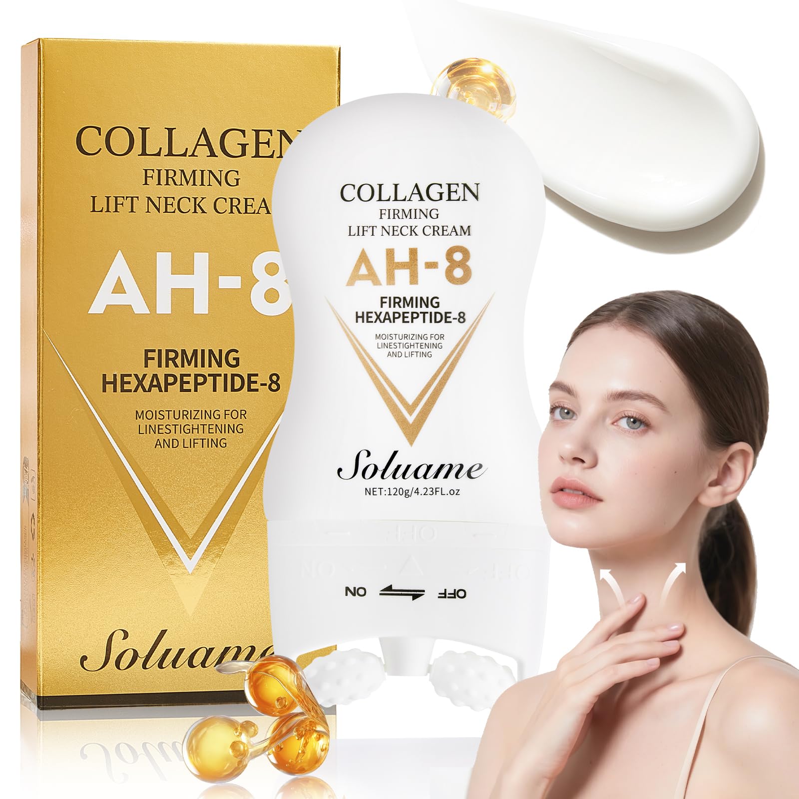 Easy to use: turn the tube cap to the "ON" position, press the roller ball on the neck, squeeze out the cream and gently massage it into the neck, so that the cream can penetrate deeper into the skin. Wait 2-3 minutes before putting on, use the cream twice a day (morning and evening). Give your neck back the beauty of a swan neck: this neck cream not only reduces neck creases, but also helps to form a beautiful, elegant swan neck, making the neck tighter and more youthful. Double Roller Ball Design: The double roller ball design of the AH-8 Collagen Neck Cream effectively massages the neck area and helps the cream penetrate deep into the skin and restore firmness and vitality. Suitable for all skin types: This neck cream is gentle and safe and suitable for all skin types. It has a light, silky texture that is quickly absorbed and leaves a fresh, non-greasy skin feeling. It is suitable for both men and women and is therefore the ideal choice for daily neck care. Specially developed for reducing neck wrinkles: this AH-8 collagen neck cream contains the AH-8 firming formula and provides deeply effective care. When used regularly, it reduces wrinkles on the neck, improves skin elasticity and gives the neck firmness and vitality.AH-8 Firming Neck Cream, Collageen Halscrème voor het verstevigen en stevigen van de huid met massagerol, hydraterende crème voor mannen en vrouwen, 120 gEenvoudig in gebruik: draai de tubessluiting op de positie "ON", druk de rollerbal op de hals, druk de crème eruit en masseer deze zachtjes in de hals, zodat de crème dieper in de huid kan doordringen. Wacht 2-3 minuten voordat je je aantrekt, gebruik de crème tweemaal daags ('s ochtends en 's avonds). Geef je nek de schoonheid van een zwanenhals terug: deze nekcrème vermindert niet alleen halsplooien, maar helpt ook om een mooie, elegante zwanenhals te vormen, waardoor de nek strakker en jeugdiger wordt. Dubbel rollerball-design: het dubbele rollerball-ontwerp van de AH-8 Collageen nekcrème masseert effectief het nekgebied en helpt de crème diep in de huid door te dringen en stevigheid en vitaliteit te herstellen. Geschikt voor alle huidtypes: deze nekcrème is zacht en veilig en geschikt voor alle huidtypes. Het heeft een lichte, zijdeachtige textuur die snel intrekt en een fris, niet-vettig huidgevoel achterlaat. Hij is geschikt voor zowel mannen als vrouwen en dus de ideale keuze voor de dagelijkse nekverzorging. Speciaal ontwikkeld voor het verminderen van nekrimpels: deze AH-8 collageen nekcrème bevat de AH-8 verstevigingsformule en zorgt voor een diep effectieve verzorging. Bij regelmatig gebruik vermindert het rimpels in de nek, verbetert de elasticiteit van de huid en geeft het de nek stevigheid en vitaliteit.