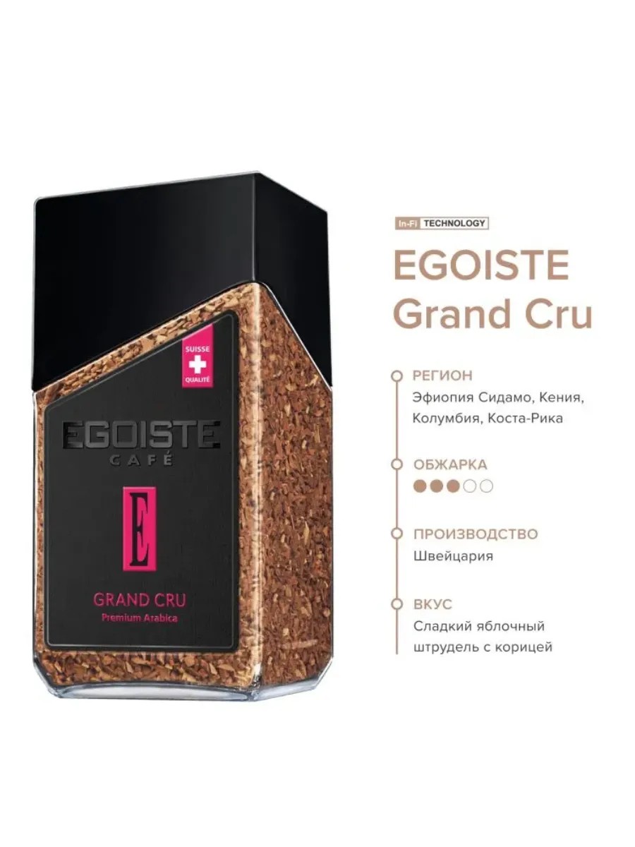 EGOISTE Grand Cru произведён по технологии In-Fi — молотый в растворимом. Это бленд растворимой мытой арабики из Эфиопии Сидамо, Кении и Колумбии c добавлением молотой спешелти-арабики анаэробной ферментации из Коста-Рики. Сладкий вкус яблочного штруделя дополняется мягкими оттенками корицы, делая кофе поистине безупречным.