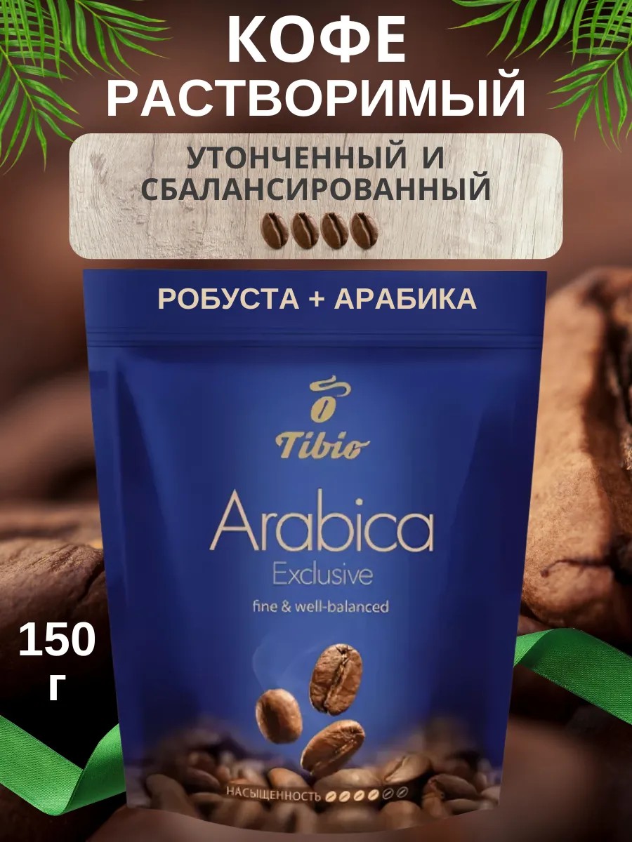 Tibio (Тибио) Кофе растворимый Exclusive Arabica 150 г. Это утонченный купаж арабики из Латинской Америки и насыщенной робусты. Этот кофе обладает тонким ароматом и гармоничным вкусом с легкой кислинкой и ореховым послевкусием. Он идеально подходит для приготовления американо и других напитков на основе растворимого кофе.
