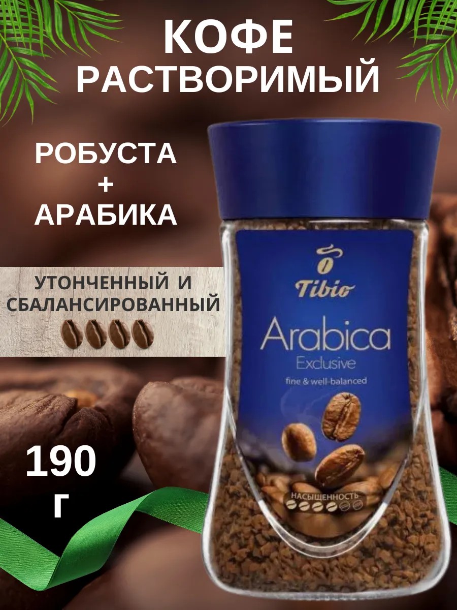 Tibio (Тибио) Кофе растворимый Exclusive Arabica 190 г. Это утонченный купаж арабики из Латинской Америки и насыщенной робусты. Этот кофе обладает тонким ароматом и гармоничным вкусом с легкой кислинкой и ореховым послевкусием. Он идеально подходит для приготовления американо и других напитков на основе растворимого кофе.