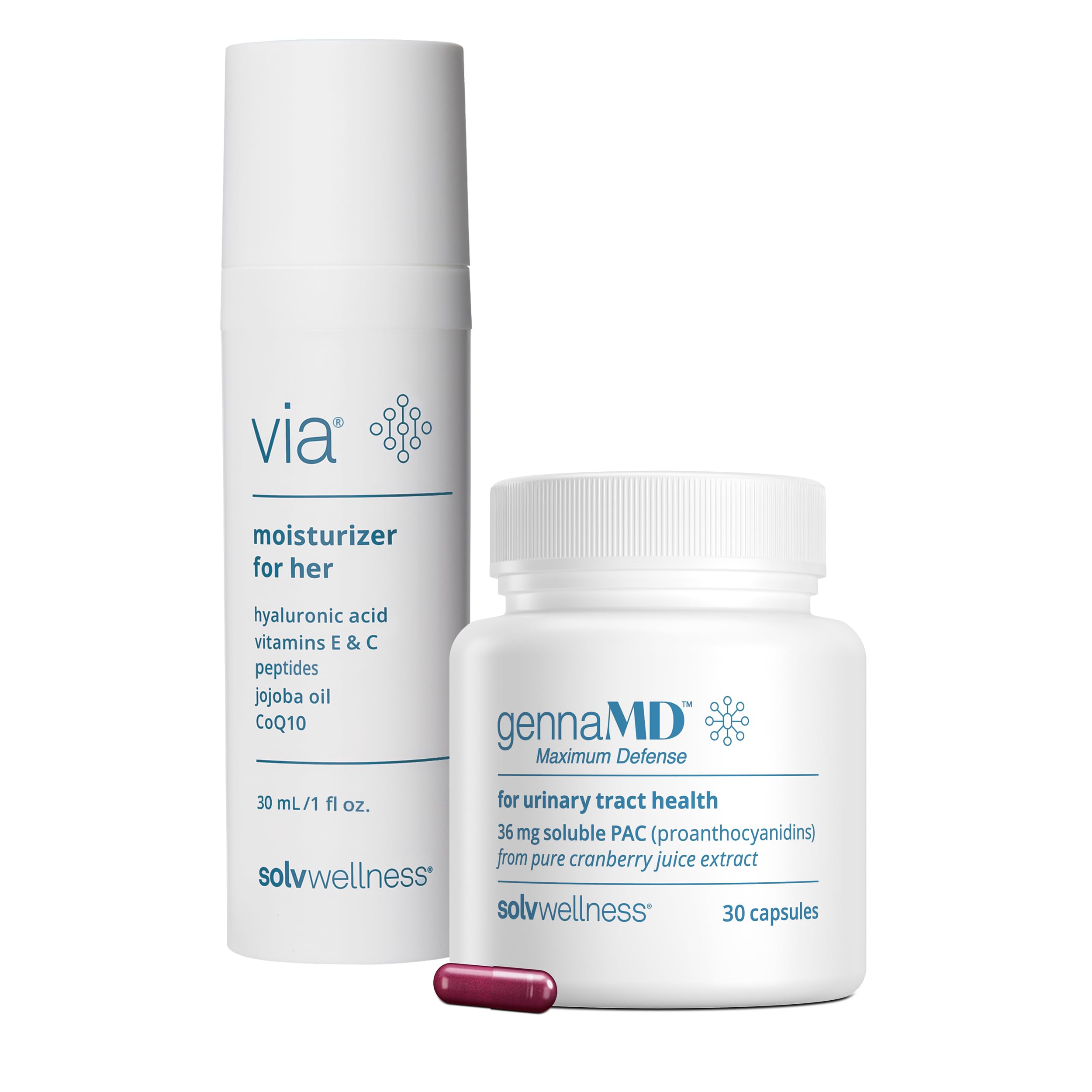 GennaMD is clinically proven UTI defense. Once daily capsule with powerful PAC to help you get ahead of UTIs and is urologist recommended. 36mg of soluble PAC from 100 pure cranberry juice extract. Contains virtually no vitamin K, oxalates, or sugar. Gluten Free. Vegan. Non-GMO. Veggie capsule. No unnecessary fillers, artificial preservatives, colors, or sweeteners, and no corn, dairy, soy wheat, or yeast. Via by Solv Wellness vaginal moisturizer works with a woman's body to replenish moisture in and around the vagina. Unlike lubricants that provide temporary relief during sex, Via by Solv Wellness is designed to be quickly absorbed by the skin to help resolve the underlying issue of dryness—and it also can be used as a lubricant to make sex more comfortable. The water-based formula is hormone-free and fragrance-free, comprised of high-quality ingredients that work together to enhance skin hydration: hyaluronic acid: a humectant with potent water-binding capacity a next-generation form of vitamin C (tetrahexyldecyl ascorbate) that lasts 80x longer than standard ascorbic acid vitamin E and CoQ10 which aid in the restoration of the lipid barrier and promote cell membrane functionality peptides (amino acids), which support collagen and elastin, aiding tissue hydration and maximizing delivery of other active ingredients and jojoba oil which helps accelerate wound healing, promotes hydration and smoother, softer skin, and gives Via by Solv Wellness its silky, serum-like texture. Vaginal dryness can cause discomfort, itching, irritation, and pain during sex or while urinating, and if left untreated, can disrupt the microbiomes of the vagina, bladder, and urinary tract, increg the risk for infection. Whether used at home or during travel, this 30 ml non-hormonal moisturizing serum comes in an airless pump that ensures you'll be able to squeeze out every last drop from the bottle. Intimate pelvic issues can be uncomfortable, but they're common, and there's no reason to suffer in silence when reliable solutions are available. Solv Wellness is committed to helping women achieve optimal pelvic health to live comfortably and confidently in midlife and beyond. Our science-based solutions help promote comfort for the entire female pelvic triangle (gut, vagina, and urinary tract). In addition to vaginal creams, we offer UTI cranberry supplement pills and bundle packs.DAILY REGIMEN: Urologist recommended for daily use. High-quality formulas and free from hormones, unnecessary fillers, preservatives, GMOs, gluten, and common allergens. NON-HORMONAL SUPPORT: Both products are hormone-free and can be used alone or alongside vaginal estrogen as advised by your doctor suitable during menopause, perimenopause, or postpartum. GENNAMD CRANBERRY JUICE EXTRACT- 36 MG SOLUBLE PAC: The highest concentration of clinically proven PAC available to help you get ahead of urinary tract infections. 30-day supply to help defend against UTI-causing bacteria. VIA VAGINAL MOISTURIZER: Hormone-free, pH-balanced daily vaginal moisturizer with hyaluronic acid, peptides, and vitamins. Fast-absorbing formula to help relieve vaginal dryness, replenish moisture, and soothe and condition intimate skin. WOMEN'S DAILY VAGINAL URINARY HEALTH BUNDLE: Via vaginal moisturizer helps hydrate and soothe intimate skin, while GennaMD cranberry supplement supports urinary tract health. Non-hormonal, high-quality, doctor–recommended formulas.