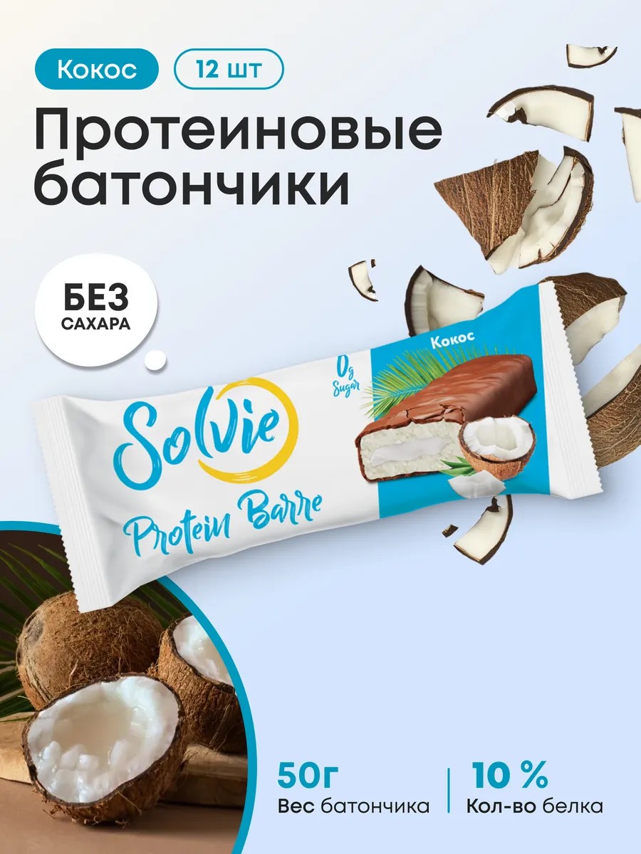 Coconut-flavored protein bars from Solvie. 12 bars per pack. The new Solvie bars are sweets you can always have!