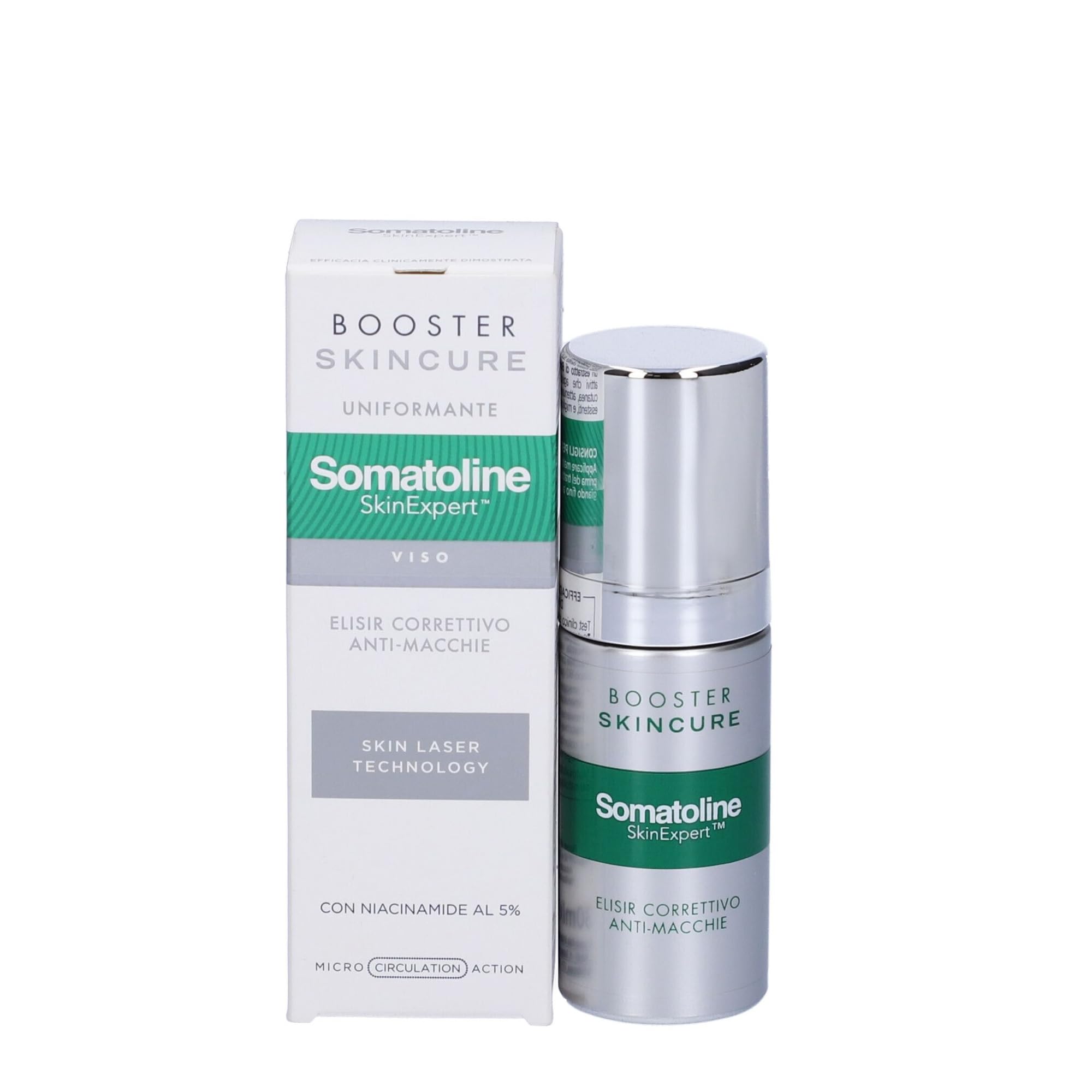 This unifying treatment, inspired by skin laser technology, corrects the appearance of visible blemishes and reduces the appearance of discoloration, leaving skin more even and visibly brighter. Its formula is based on 5 Niacinamide, Boerhavia extract, and other active ingredients that act on skin pigmentation, diminishing existing discoloration and blemishes, and improving skin tone. SAFETY WARNING Avoid direct contact with eyesFormat: 30 ml bottle. Directions for use: Apply morning and evening to a cleansed face before your usual skincare routine, until completely absorbed. This aesthetic medicine technique effectively treats skin blemishes: it offers dual corrective and preventative action stimulates the reduction of blemishes in size and intensity improves skin tone and leaves the skin radiant and even. This unifying treatment, inspired by skin laser technology, corrects the appearance of visible blemishes and counteracts the appearance of discoloration, leaving the skin more uniform and visibly brighter. Its formula is based on 5 Niacinamide, Boerhavia extract, and other active ingredients that act on skin pigmentation, reducing discoloration and existing blemishes, and improving skin tone.SOMAT SKIN EX SKIN ELISIR 30 mlDESCRIPTION DU PRODUIT DESCRIPTION DU PRODUIT Ce traitement uniformisant, inspiré de la technique de skin laser, corrige l'apparence des taches visibles et contraste l'apparition de dyschromies, rendant la peau plus uniforme et visiblement plus lumineuse. À la base de sa formule Niacinamide à 5 , un extrait de Boerhavia et d'autres ingrédients actifs qui agissent sur la pigmentation cutanée, atténuant les dischromes et les taches existantes, et améliorent le teint. AVERTISSEMENT DE SÉCURITÉ Évitez tout contact direct avec les yeuxFormat : flacon de 30 ml. Mode d'emploi : Appliquer matin et soir sur le visage nettoyé avant le traitement habituel, jusqu'à absorption complète. Technique de médecine esthétique capable d'agir efficacement dans le traitement des taches cutanées : double action corrective et préventive stimule la réduction des taches en taille et en intensité améliore le teint et rend la peau lumineuse et homogène. Ce traitement uniformisant, inspiré de la technique de skin laser, corrige l'apparence des taches visibles et contraste l'apparition de dyschromies, rendant la peau plus uniforme et visiblement plus lumineuse. À la base de sa formule Niacinamide à 5 , un extrait de Boerhavia et d'autres ingrédients actifs qui agissent sur la pigmentation cutanée, atténuant les dischromes et les taches existantes, et améliorent le teint.