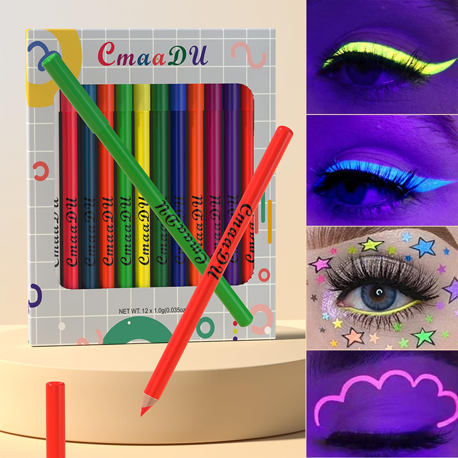 12 Colors Fluorescent Glow Eyeliner, UV Neon Eyeliner Set: ✓ Easy to use, has the ability to shape and combine different makeup styles. ✓Easy to paint, durable, makes your eyes look bigger and more beautiful. ✓ To emphasize the shape and color of your eyes by using eyeliner. ✓ Can be used as an eyeliner stick and eye shadow stick. ✓ 12 rainbow colored eyeliner are ideal for parties, cosmetic shows, daily makeup, including popular colors such as white, green, yellow, red, brown, blue etc., making you an eye-catcher on any occasion. INSTRUCTIONS FOR USE Draw a fine and delicate line on the eyelid according to your preferences✓ Matte Eyeliner Set: 12 different colorful eyeliners, ideal for parties, beauty shows, live shows, proms, dance parties and wedding makeup. With a unique package, it is the perfect gift for Christmas and Halloween. ✓ Multi-tasking: Highly pigmented colorful eyeliner can be used for different occasions such as birthday party, music show, dance party, wedding. Perfect for making eye art or face painting, easy to master for beginners and professionals. ✓ Highly pigmented: It has an ultra-fine brush with a very defined felt tip, flows continuously and smoothly, can easily create a delicate and attractive eyeliner, easily apply fine lines and layer colors. You can create many small details in the eye. ✓ Water Resistant: The glitter eyeliner is extremely waterproof and dries quickly after application without fading, and lasts up to 12 hours. ✓ 12 Colors Eyeliner: Delivery includes 12 pieces UV neon eyeliner. The colors are red, orange, light orange, yellow, green, pink, rose red, dark pink, light blue, blue, purple, grape purple.12 stuks UV eyeliner set, UV Glow Matte eyeliner, gekleurde eyeliner, neon matte eyeliner set, waterdicht en veegvast, duurzaam, voor dagelijks gebruik en Halloween, Kerstmis 12 kleuren fluorescerende glow-eyeliner, uv-neon-eyeliner-set: ✓ Eenvoudig te gebruiken, heeft de mogelijkheid om verschillende make-upstijlen vorm te geven en te combineren. ✓ Eenvoudig te verven, duurzaam, je ogen zien er groter en mooier uit. ✓ Om de vorm en kleur van je ogen te benadrukken door het gebruik van eyeliner. ✓ Kan als eyeliner-stift en oogschaduwstift worden gebruikt. ✓ 12 regenboogkleurige eyeliner zijn ideaal voor feestjes, cosmeticashows, dagelijkse make-up, inclusief populaire kleuren zoals wit, groen, geel, rood, bruin, blauw enz., zodat je bij elke gelegenheid een blikvanger wordt. GEBRUIKSAANWIJZING Teken een fijne en delicate lijn op het ooglid volgens je voorkeuren✓ Matte eyelinerset: 12 verschillende kleurrijke eyeliners, ideaal voor feestjes, schoonheidsshows, live shows, afstudeerbals, dansfeesten en bruiloftsmake-up. Met een uniek pakket is het het perfecte cadeau voor Kerstmis en Halloween. ✓ Multi-tasking: sterk gepigmenteerde kleurrijke eyeliner kan worden gebruikt voor verschillende gelegenheden zoals verjaardagsfeest, muziekshow, dansfeest, bruiloft. Perfect voor het maken van oogkunst of gezichtsbeschildering, gemakkelijk te beheersen voor beginners en professionals. ✓ Sterk gepigmenteerd: het heeft een ultrafijne borstel met een zeer gedefinieerde viltpunt, stroomt continu en glad, kan gemakkelijk een delicate en aantrekkelijke eyeliner creëren, gemakkelijk fijne lijntjes aanbrengen en kleuren samenlagen. Je kunt veel kleine details in het oog creëren. ✓ Waterbestendig: de glitter-eyeliner is extreem waterdicht en droogt snel na het aanbrengen zonder te vervagen, en gaat tot 12 uur mee. ✓ 12 kleuren eyeliner: de levering omvat 12 stuks UV neon eyeliner. De kleuren zijn rood, oranje, lichtoranje, geel, groen, roze, rozerood, donkerroze, lichtblauw, blauw, paars, druivenpaars.