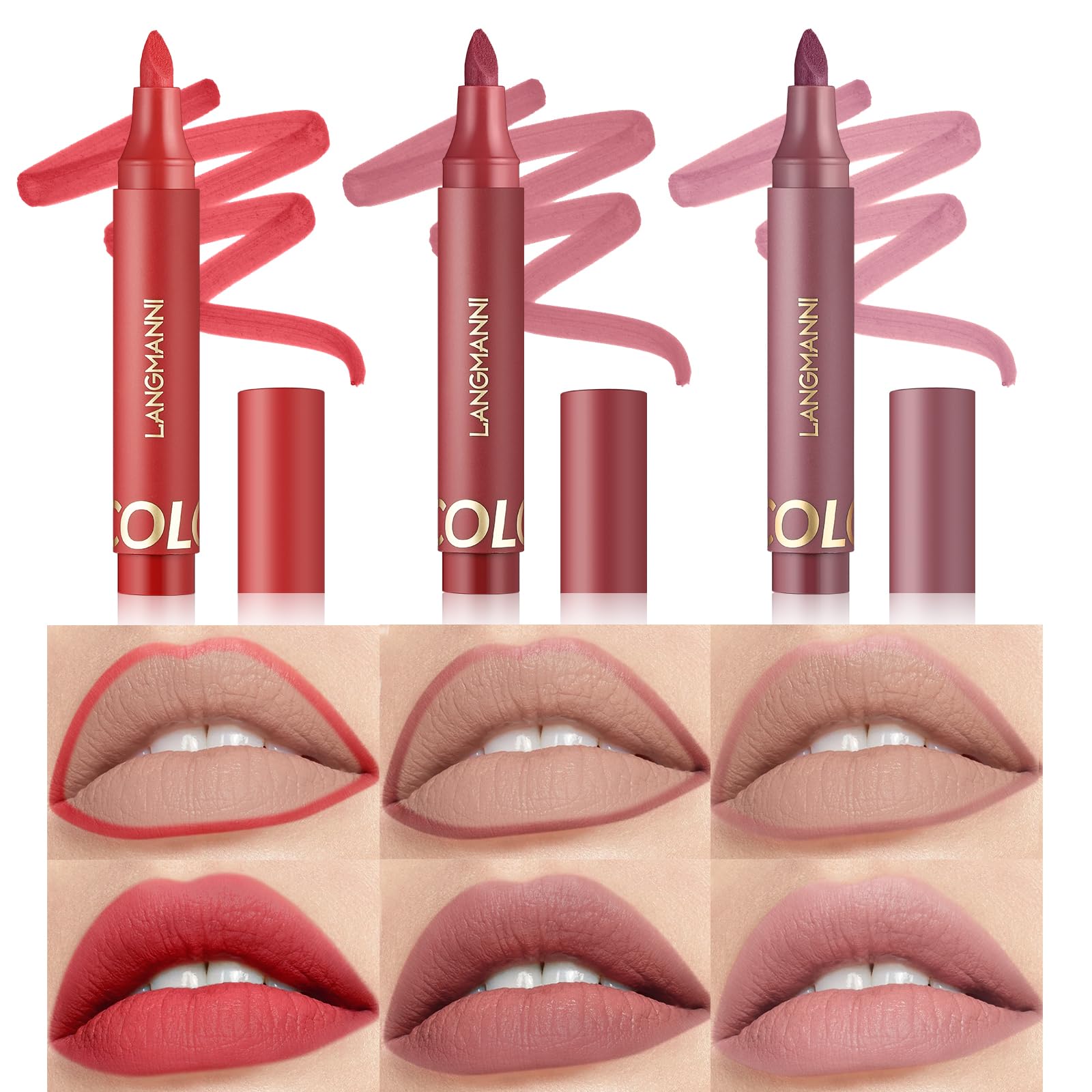 Matte lippenstift van Langfanni in stoffige roze tint #02, met producttube en lipstalen waarop