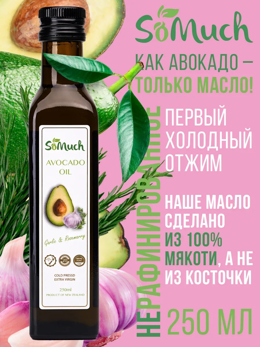 Масло авокадо с чесноком и рзмарином Somuch - это здоровая альтернатива оливковому маслу. Оно идеально подходит для интенсивной обжарки в воке или на сковороде, маринада для стейков, а также запекания и жарки на гриле. Его важнейшее преимущество - универсальность в применении, возможная благодаря высокой температуре дымообразования. Однородная плотная консистенция и свежий натуральный вкус позволяют использовать масло как заправку для салатов, основу для соуса и приправу. Наше масло авокадо, с добавлением масла чеснока и розмарина, улучшит вкус любого блюда, от стейков до супов. Продукт сохраняет в себе все полезные свойства, обладает низкой кислотностью и подходит для диетического, вегетарианского и правильного питания.