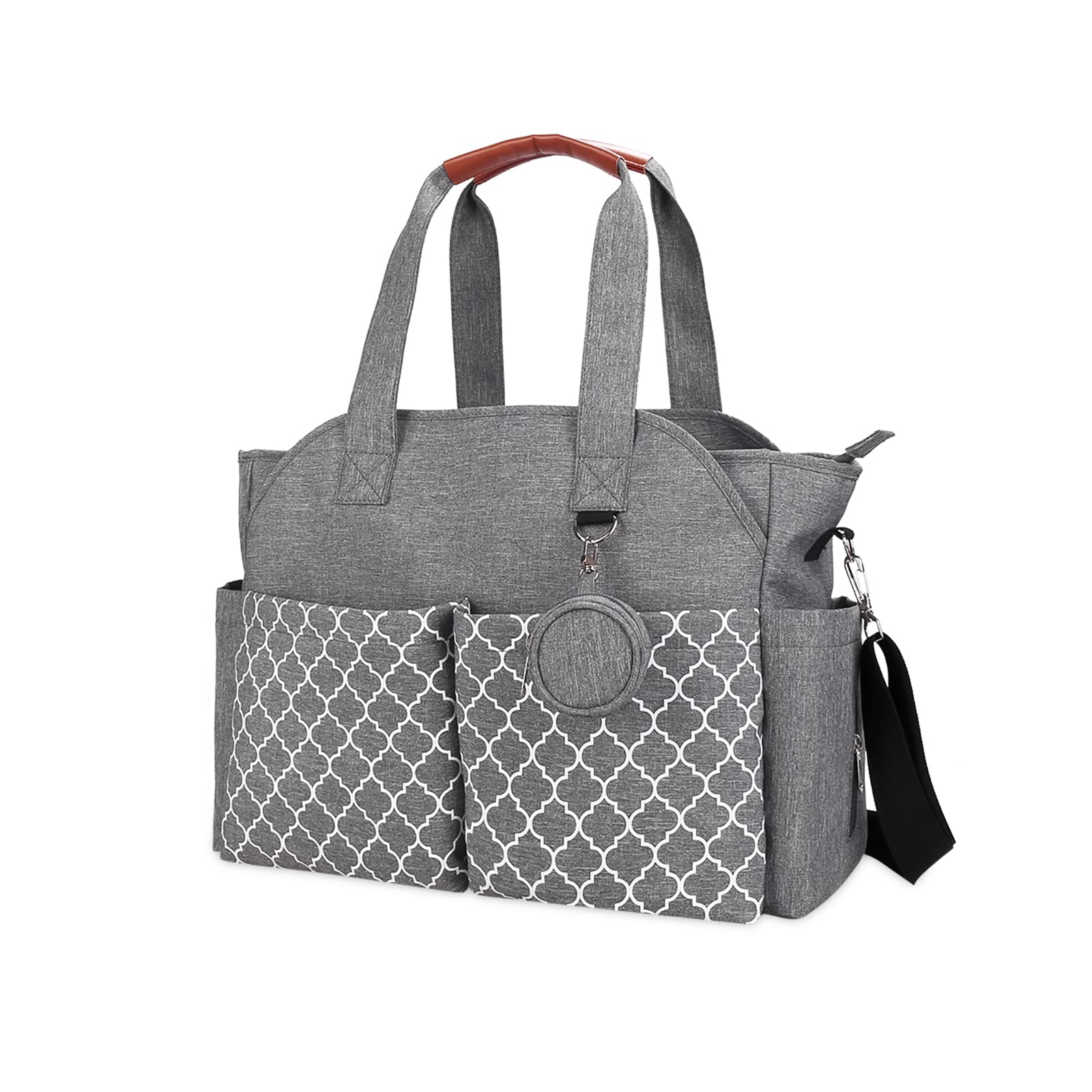After-sales Service: We are committed to each customer to provide dedicated service, and bear the responsibility of each product quality. Our goal is to win the customer's satisfaction with the best products and services. If you have any questions or suggestions, please contact us and we will reply as soon as possible. Thoughtful Details: The main pocket is wide opening for easy access. The shoulder strap is adjustable from 60CM to 114CM according to your need, also it is designed with a soft detachable shoulder pad so that you can carry it comfortably. The PU leather top handle is not only beautiful but allows for easy grabbing. Convertible Design: Comes with an adjustable shoulder strap, the nappy tote bag can be used as a shoulder bag or cross-body bag. It can be used as a handbag, messenger bag, maternity bag, travel bag, weekend bag, etc for mum and dad. Suitable for many occasions such as walking, shopping and traveling with baby, brings great safety and convenience in outdoor life. Large Storage: Well-organized structure with all sorts of useful pockets. The baby nappy bag includes a main compartment with 2 insulation baby bottle pockets and a waterproof pocket, two front pockets, two side pockets for water bottles and tissues, a anti-theft back pocket to put phones or keys and an independent pacifier bag to hold baby pacifier or some small items. Waterproof Material: The baby changing bag is made of high grade waterproof polyester fabric, both the interior and exterior fabric are water-resistant and easy to wipe clean. Comes with sturdy zippers and reinforced stitching, lightweight but durable enough to sustain heavy weight. Size: 40*13*29CM (15.7*5.1*11.4 inches).