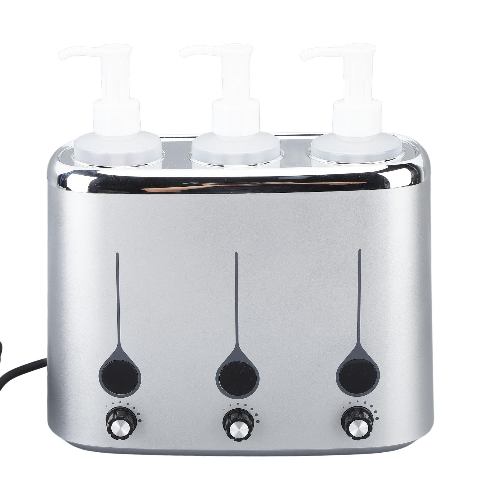 VERSATILE: Once the oil or cream reaches the desired temperature, the heater automatically stops heating. Each heating hole is also equipped with a temperature regulator so you can adjust the temperature to your specific needs. ABS MATERIAL: The heater's outer shell is made of double-layer ABS plastic. It has a beautiful metallic silver coating that prevents scratches and wear. It is suitable for both professional technicians and salon beginners. INDEPENDENT TEMPERATURE CONTROL: Each side of the heater has independent temperature control, allowing you to adjust the temperature of each bottle individually. This makes it easy to adapt to specific needs and simplifies the process. ADJUSTABLE TEMPERATURE: Press and hold the temperature control switch for two seconds to cycle through temperature modes and adjust the heating time for each bottle to maximize efficiency. 3 BOTTLES: Its ability to heat 3 different creams or oils simultaneously makes it the ideal solution for busy salons or spas. This ensures that each client is served quickly and efficiently.POLYVALENT : Une fois que l'huile ou la crème atteint la température souhaitée, le réchauffeur arrête de chauffer automatiquement. Chaque trou de chauffage est également équipé d'un régulateur de température afin que vous puissiez régler la température selon vos besoins spécifiques. Matériau ABS : la coque extérieure du chauffe-eau est fabriquée en plastique ABS double couche. Il a un beau revêtement argenté métallique qui empêche les rayures et l'utilisation. Il est pour les techniciens professionnels et les débutants en salon. CONTRÔLE DE TEMPÉRATURE INDÉPENDANT : Chaque côté du chauffe-eau dispose d'un contrôle de température indépendant, vous permettant de régler la température de chaque bouteille individuellement. Cela permet de s'adapter facilement aux besoins spécifiques et de faciliter le travail. TEMPÉRATURE RÉGLABLE : Appuyez et maintenez enfoncé l'interrupteur de contrôle de la température pendant deux secondes pour basculer entre les modes de température et régler le temps de chauffage pour chaque bouteille pour augmenter l'efficacité. 3 BOUTEILLES : Sa capacité à chauffer 3 crèmes ou huiles différentes en même temps en fait la solution idéale pour les salons ou les spas très fréquentés. Cela garantit que chaque client est pris en charge rapidement et efficacement.Sonew Bouteille Chauffe-huile de Massage, Crème de Lotion Chauffée, Chauffe-huile de Massage, Chauffe-eau Numérique pour Spa, pour Salon, Salons de Coiffure, Maison, avec Température