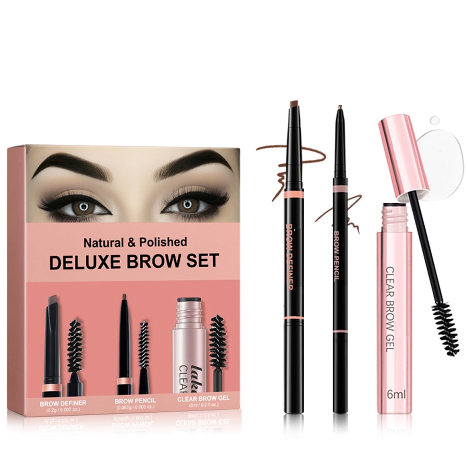 Kit complet Deluxe Brow Set pour des sourcils naturels à sauvages bien définis, avec un crayon pour un tracé précis, un crayon pour un remplissage homogène et un gel transparent pour 2